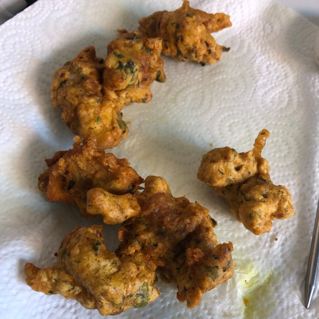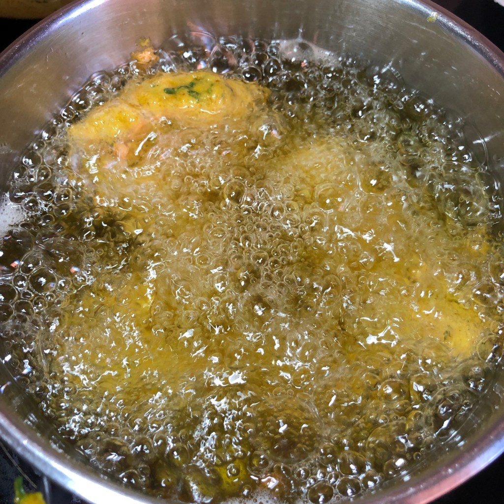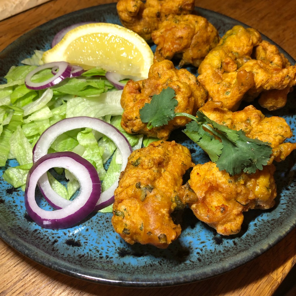 Ingredients- 250g of chicken thighs ( I only ever use chicken thighs as far more flavour) cut into small cubes, 1/2 tsp ground turmeric, 3/4 tsp garam masala, 1/2 tsp chilli powder, pinch of salt, 3/4 tsp of garlic & ginger paste, 2 tbsp of finely chopped coriander, the white of a small egg, 65g gram flour, sparkling water and rapeseed oil for frying.