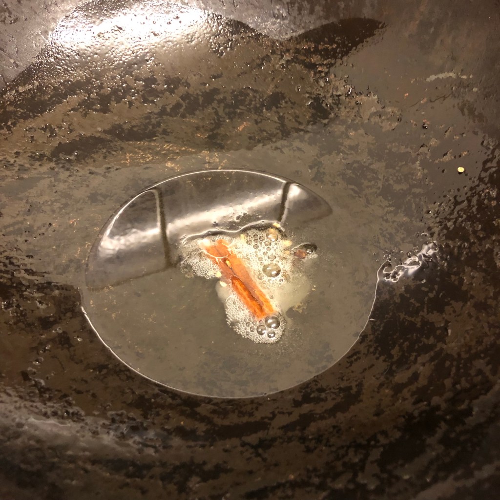 Method – heat the oil, when hot add the cinnamon stick, seeds from the cardamom pods and cloves allowing them to infuse for 30 seconds or so.