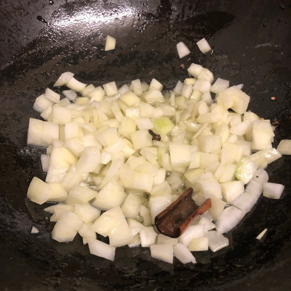 Once you can smell the oil becoming fragrant add the diced onion. Cook the onion for 6 minutes or so.