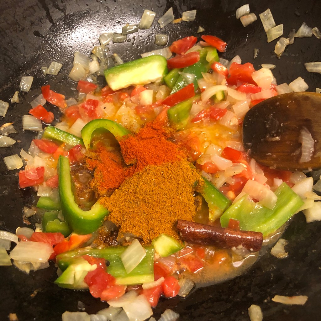 Once you’re happy with the onion add the garlic and ginger paste along with the green pepper and tomatoes allowing this to heat for a minute or so.