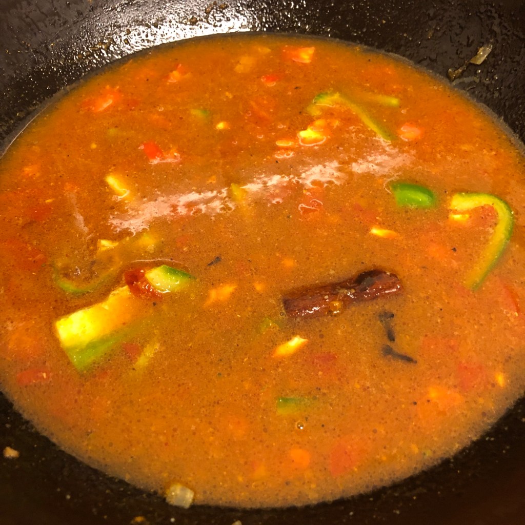Once everything is coated add the water and tamarind paste. Allow this to simmer for 10 minutes or so.