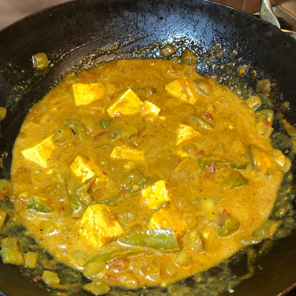 Ingredients- 1 tbsp of rapeseed oil, small cinnamon stick, seeds from 3 cardamom pods, 2 cloves, 1 onion finely diced, 1 tbsp of garlic & ginger paste, 2 tomatoes ( from the garden) finely diced, 1/2 green pepper diced, 1 1/2 tsp mixed curry powder, 1/2 tsp Kashmiri chilli powder, 200ml of water, 1 tsp tamarind paste, paneer cubed and a handful of mushrooms, 2tbsp almonds, 2 tsp smooth mango chutney, 3 tbsp of natural yogurt, salt to taste and of course coriander!!