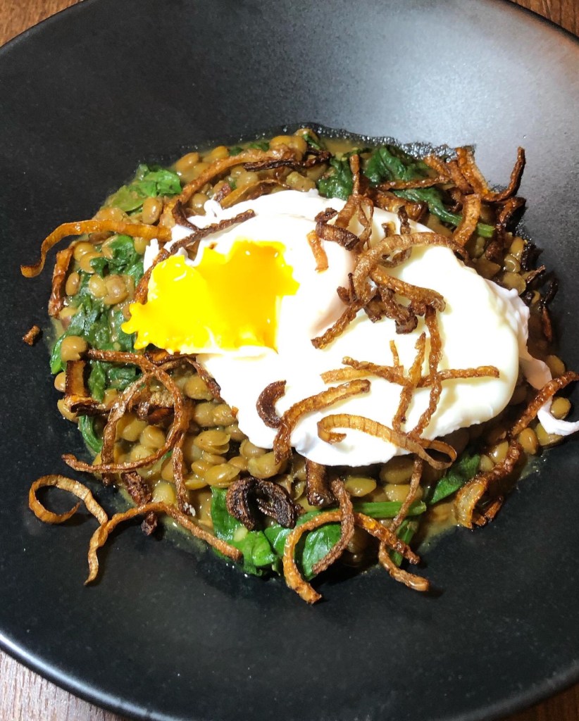 Dish 6 – Green lentil spinach daal with poached egg with crispy onions.