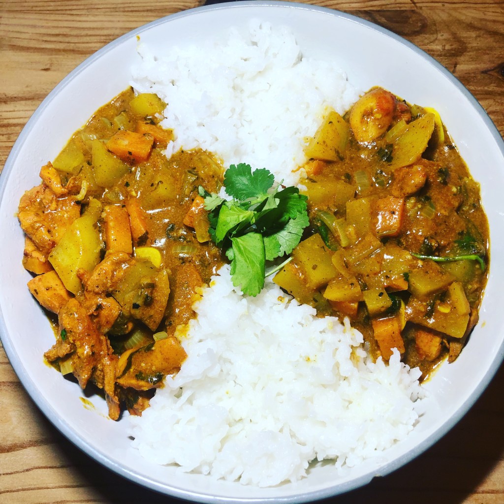 Simple ingredients- coconut oil, spring onions, coriander stalks and leaves, garlic cloves, ginger, a large potato, a large carrot, chicken thighs, curry powder, chilli powder, plain flour, chicken stock and served with rice. Recipe taken from Joe Wicks – Cooking for family and friends.