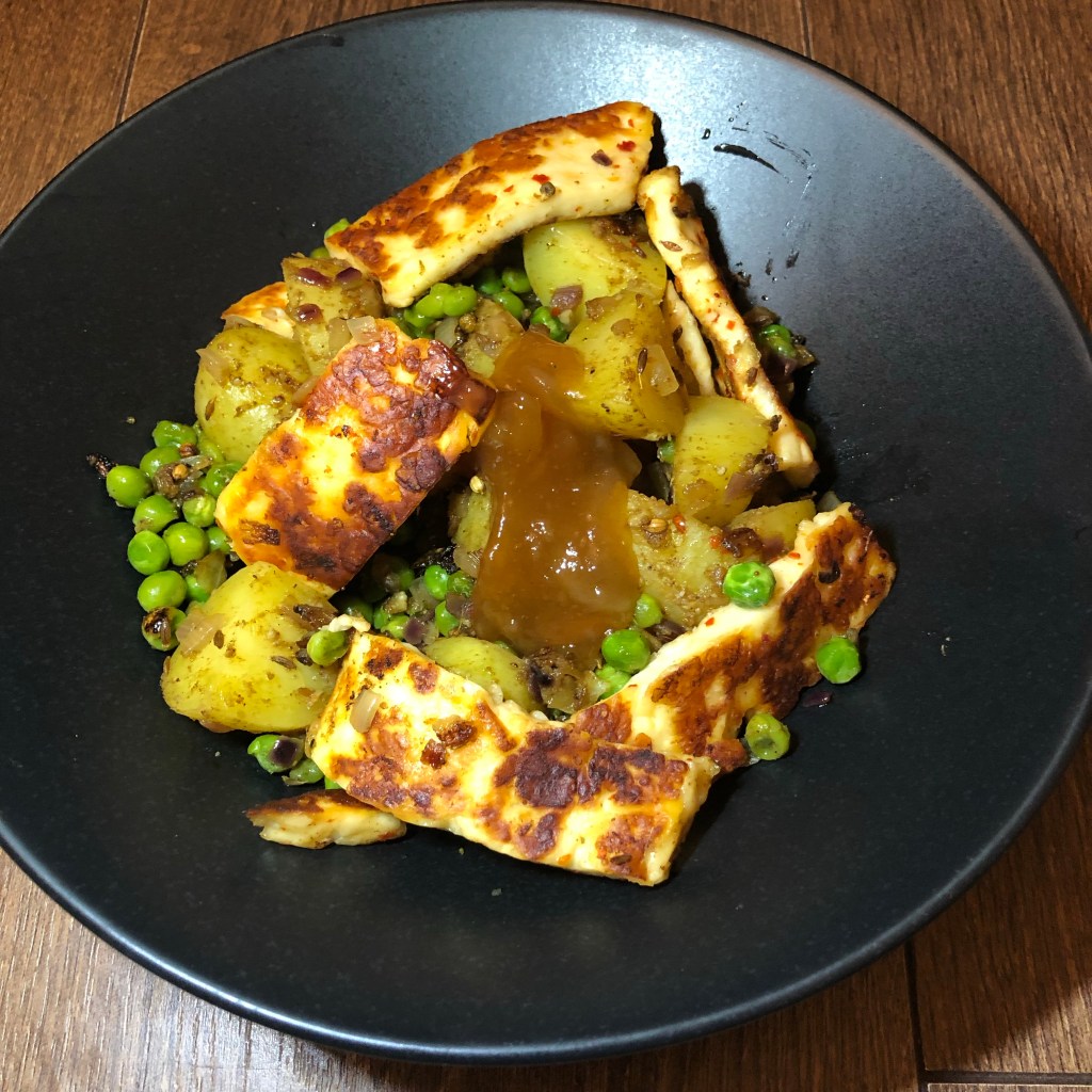 Ingredients – 6-8 new potatoes, coconut oil, small onion, salt and pepper, garlic and ginger paste, cumin seeds, coriander seeds, curry powder, frozen peas, halloumi and mango chutney. Recipe taken from Joe Wicks – 30 day kick start plan.