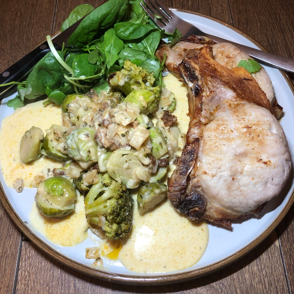 Dish 8 – Pork chops with cheesy chorizo sprouts.