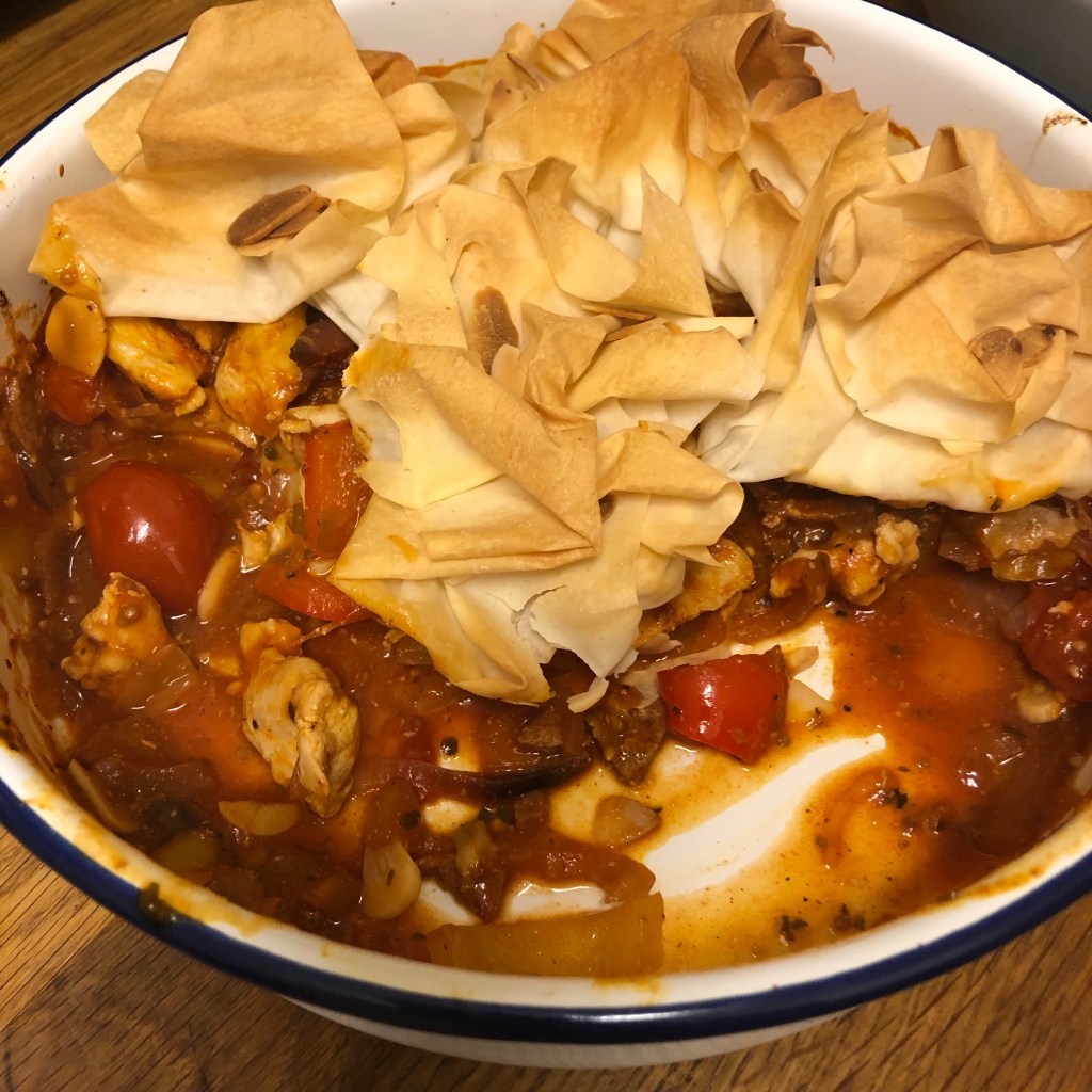 Ingredients- butter, chorizo, chicken breasts, a large red onion, 2 peppers (red & green) smoke paprika, dried oregano, tin of cherry tomatoes ( I used the tomato soup) salt and pepper, red wine vinegar, filo pastry, flaked almonds. Taken from Joe Wicks – 30 day kick start plan.
