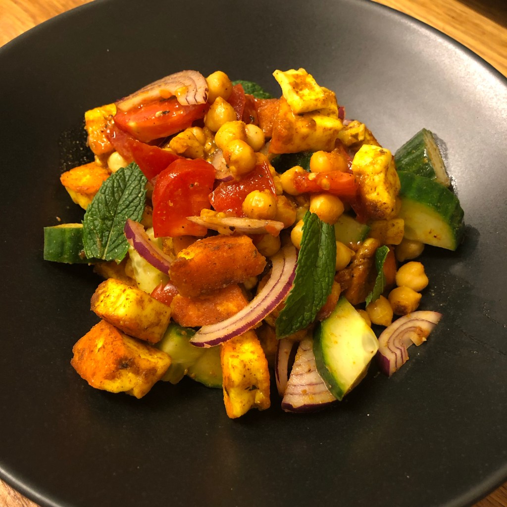 Ingredients- tin of chickpeas, 1/2 small red onion, 1/2 cucumber, a large tomato, cayenne pepper, salt and pepper, juice of a lemon, halloumi, coconut oil, tikka masala, mint leaves from the garden. Recipe taken from Joe Wicks – 30 day kick start plan.