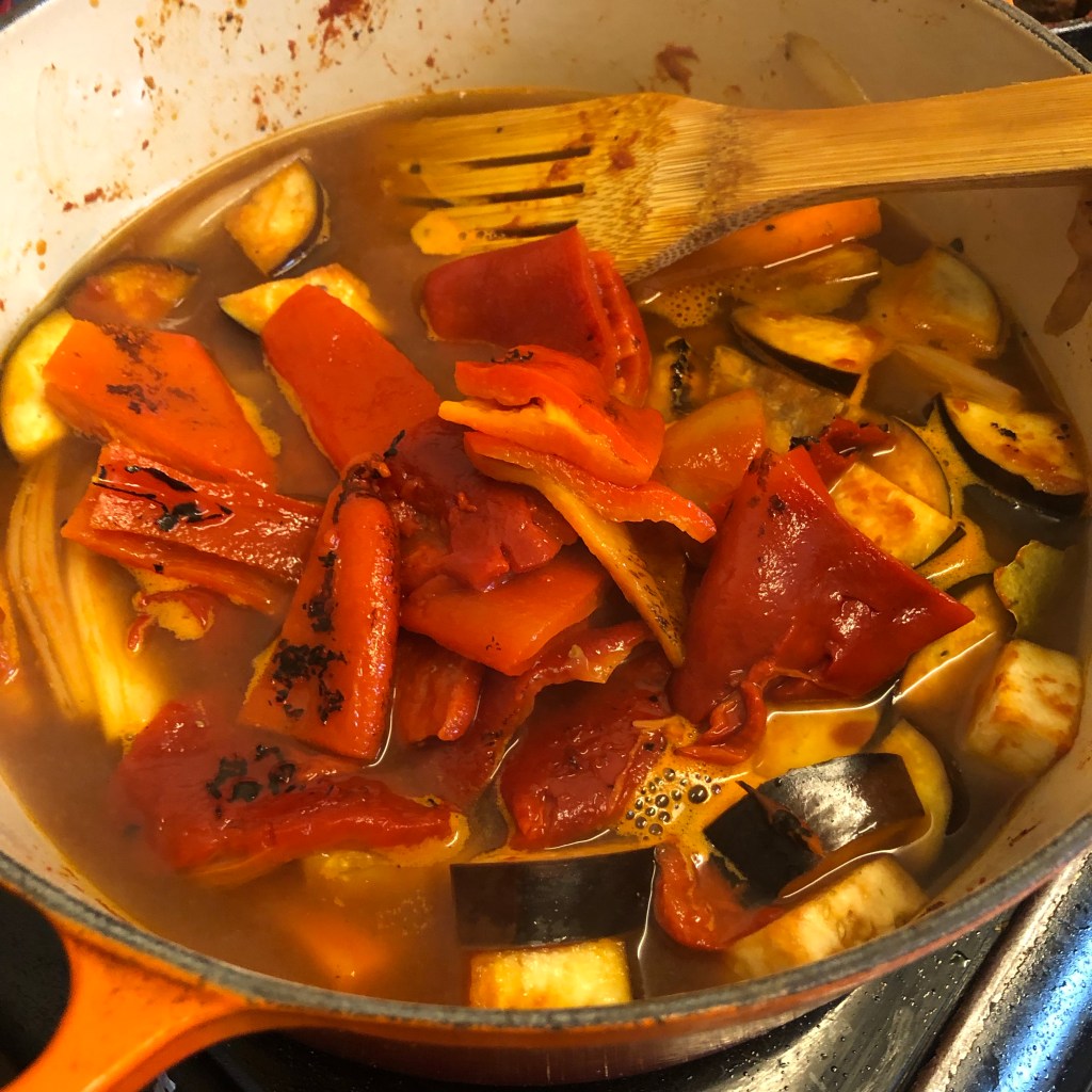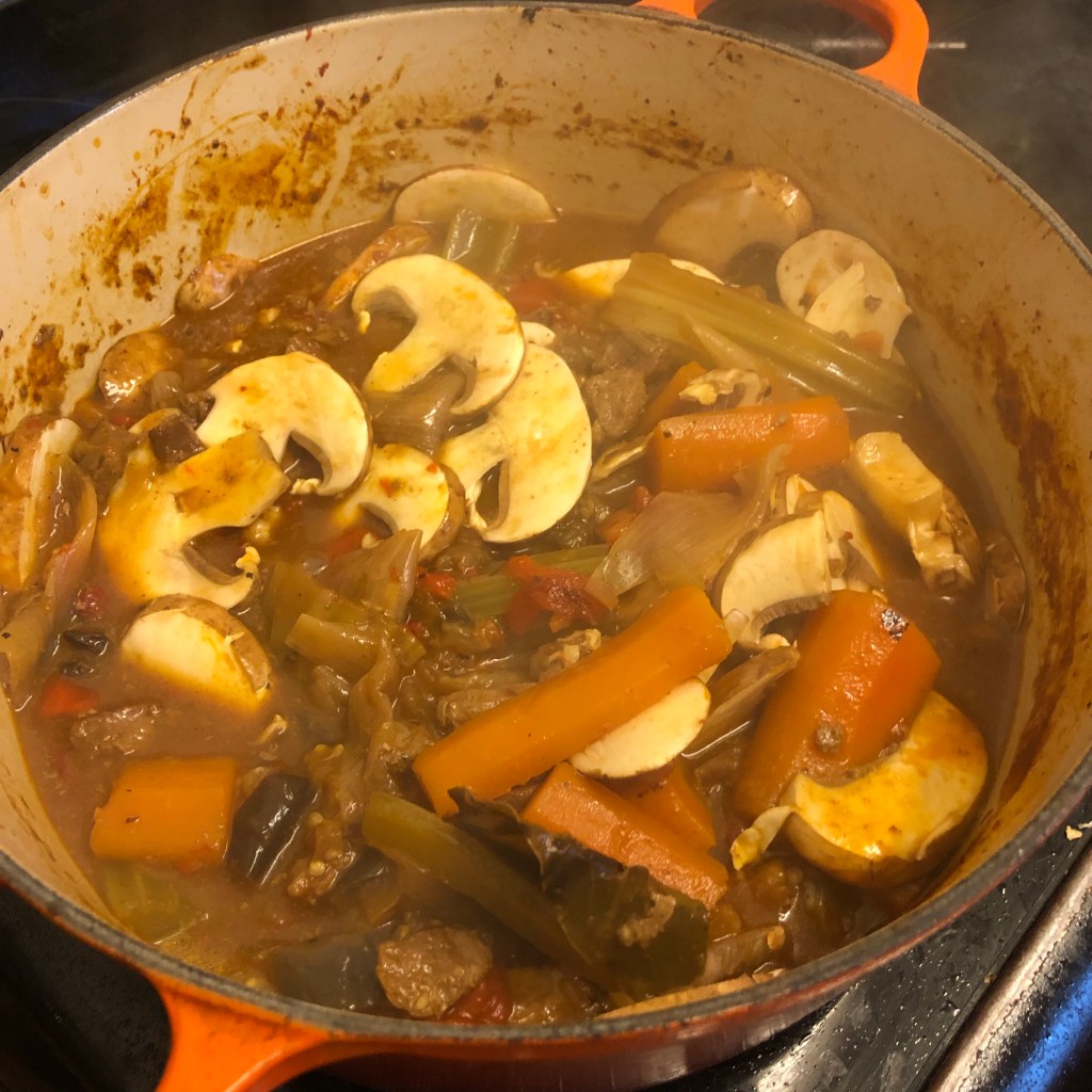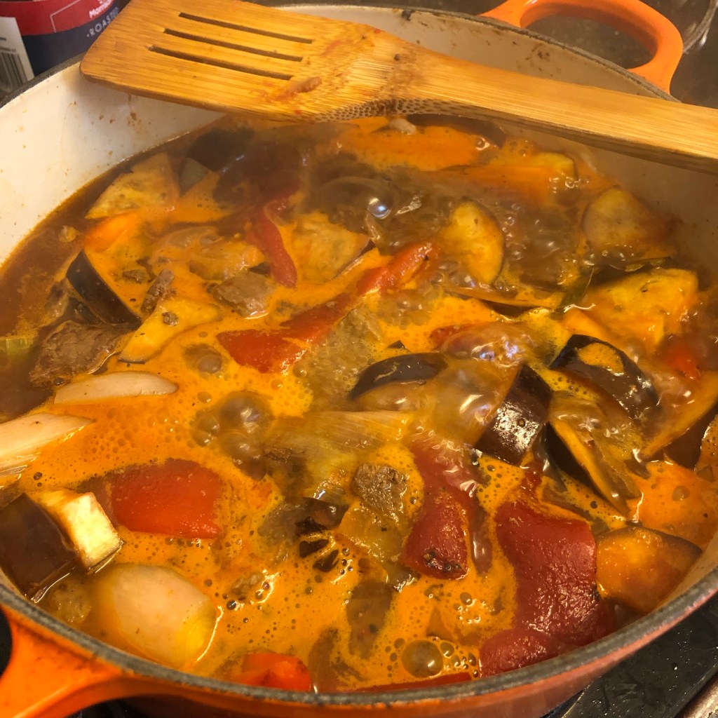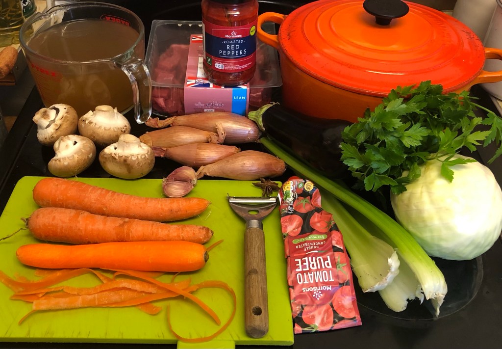 When I put all the ingredients out I was really looking forward to this dish and the process. Big chunky veg, chunky shallots that break down, celery, aubergine, beef stock, seared beef which was nice and browned, roasted peppers, mushrooms, garlic, star anise, bay leaf, tomato purée with lots of chopped parsley…..yes I thought so too!!!