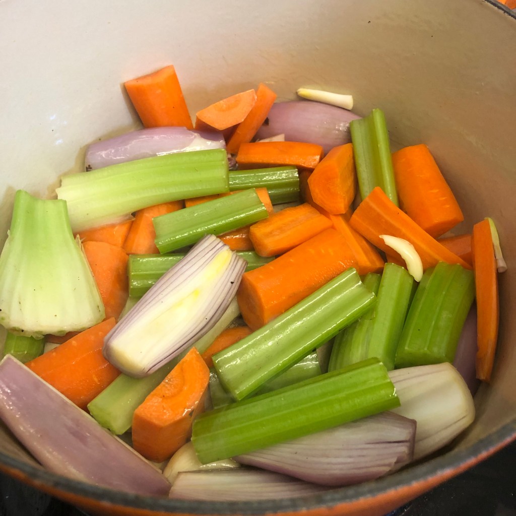 The process was as simple as it could be. Peel and cut the carrots into chunky pieces. Do the same with the shallots then chop the celery the same way, big pieces. Heat a touch of olive oil in a heavy based pan. Add the chunks of veg ( 3 carrots, 4 shallots, 4 celery sticks and 3 cloves of garlic) and bashed garlic cloves then gently fry.