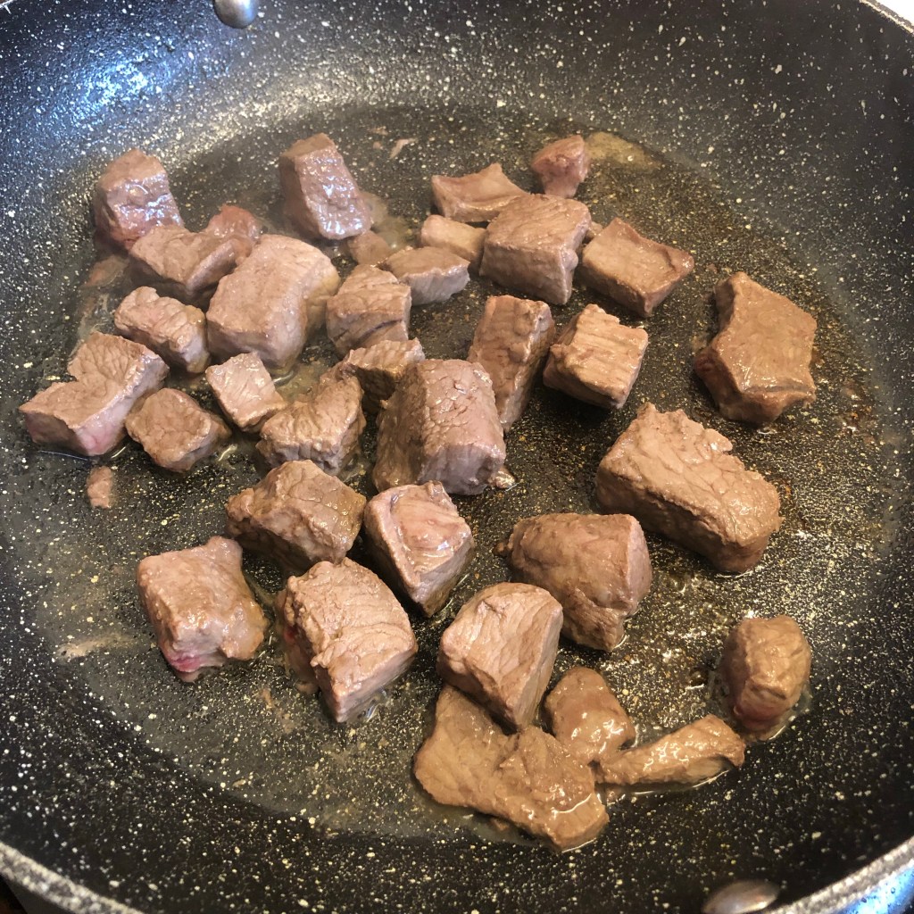 Whilst the vegetables are gently warming through add a touch of olive oil to a frying pan. Heat the oil then fry the beef in small batches. Don’t be frightened to crisp up the outsides. This goes against how I like my beef, however, this retains the flavour inside, gives a lovely crust on the outside then the beef relaxes in the stock for the stew.