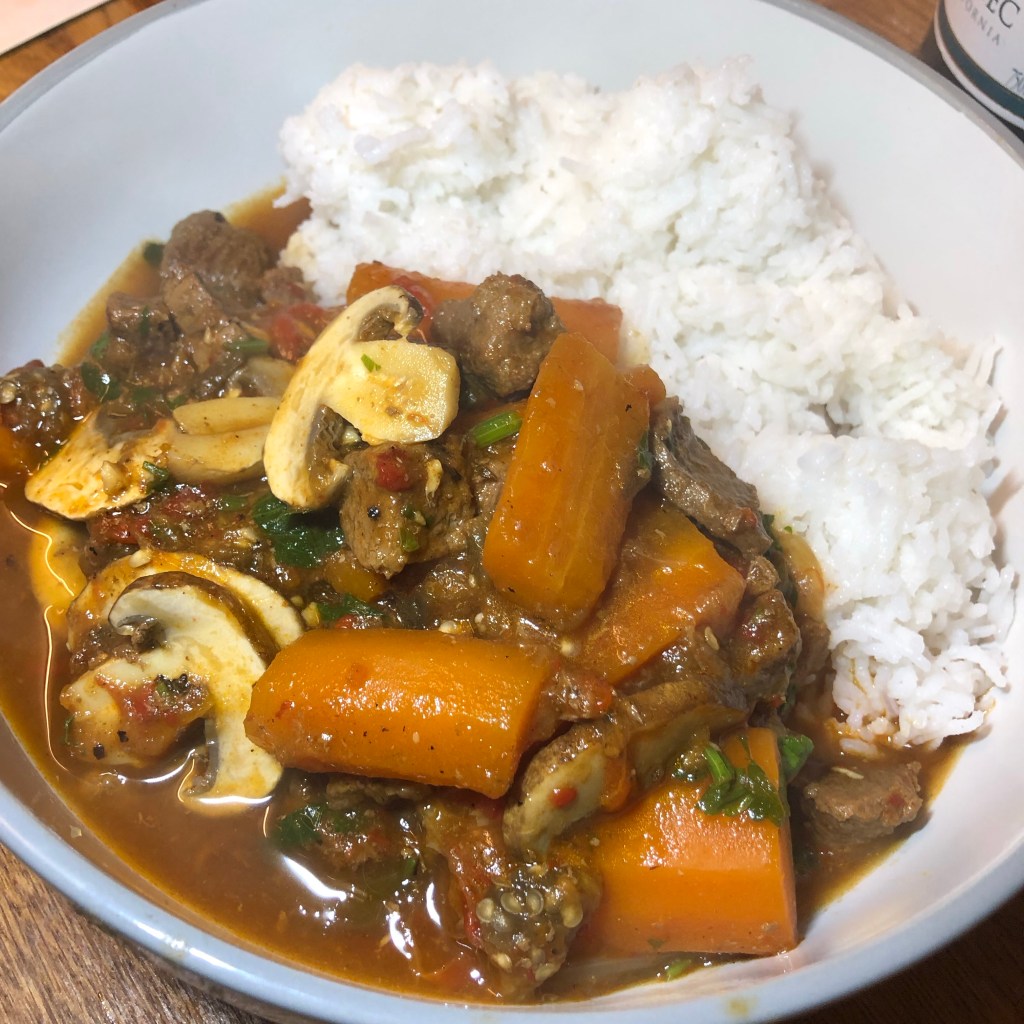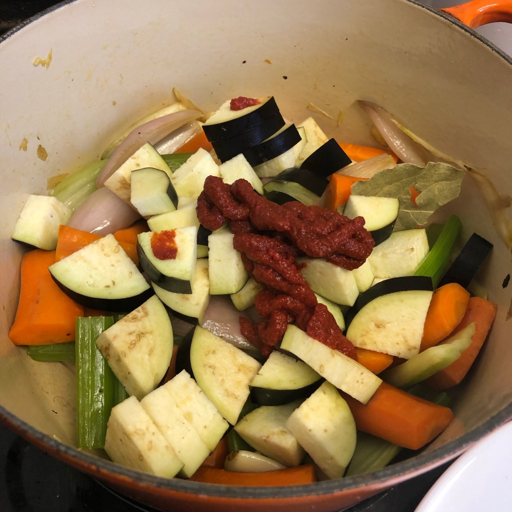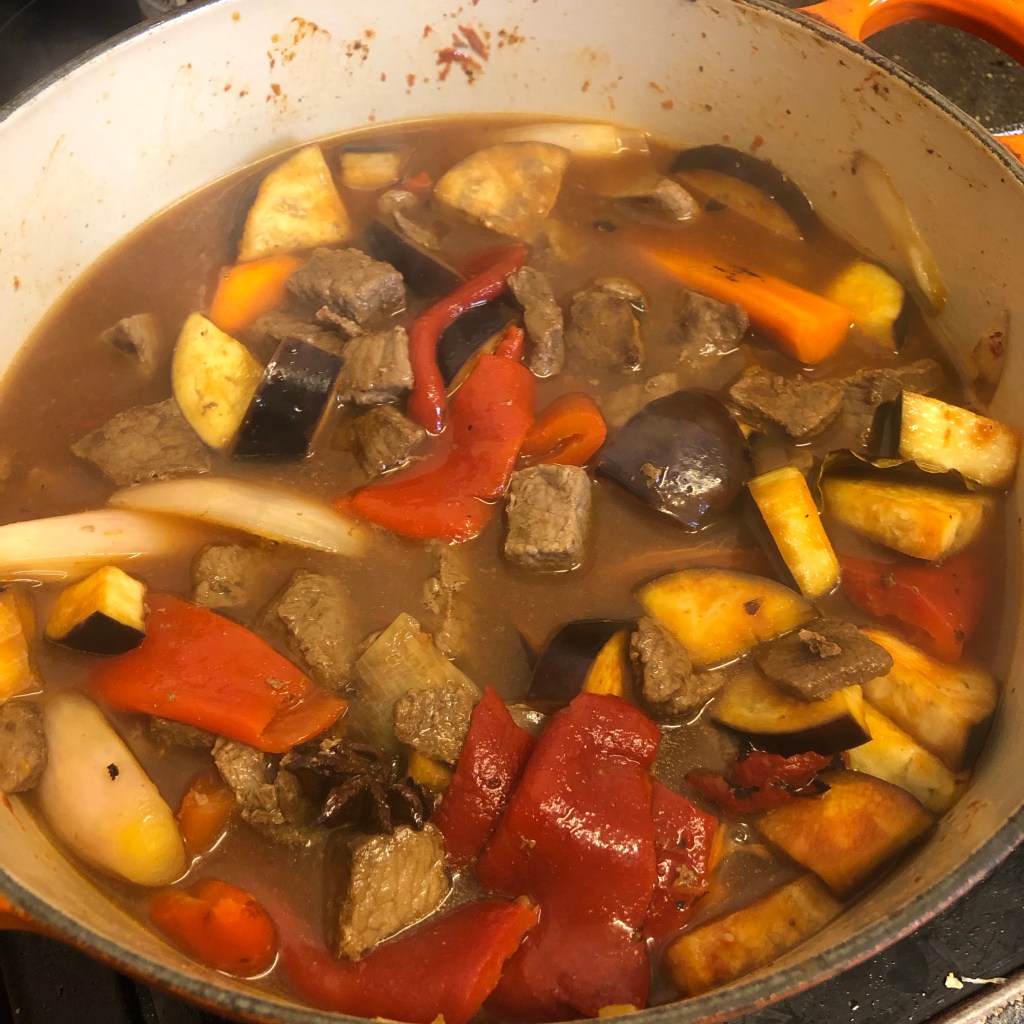 Fry the beef in small batches as not to over crowd the pan as this will poach their beef and slow down the cooking process. Retain the juices. As you put the final pieces of beef in the pan add diced aubergine, 1 tbsp of tomato purée, 1 star anise and a bay leaf in with the vegetables and give it a good stir.