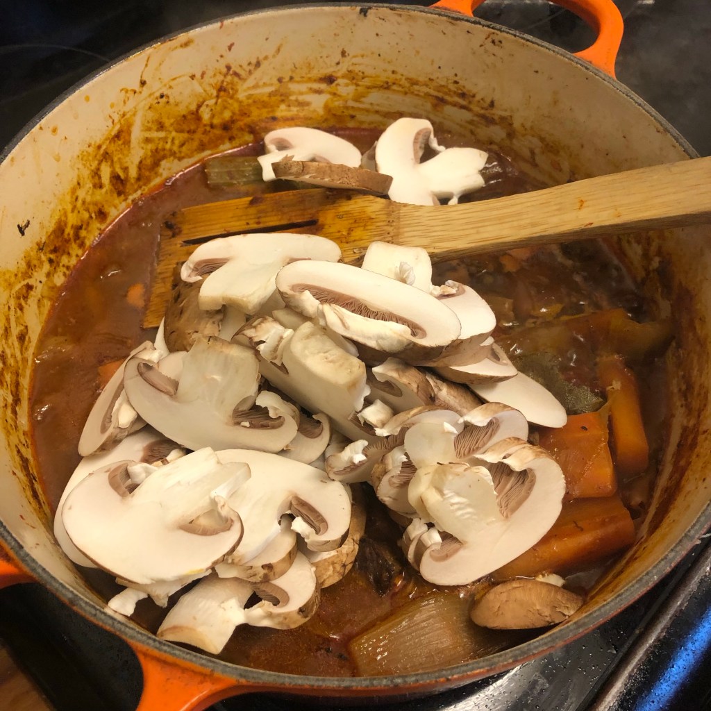If the stock looks a little dry, top it up with some boiling water from the kettle which I did. About 15 minutes from the end of cooking add your diced mushrooms.