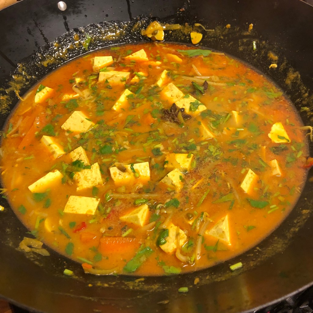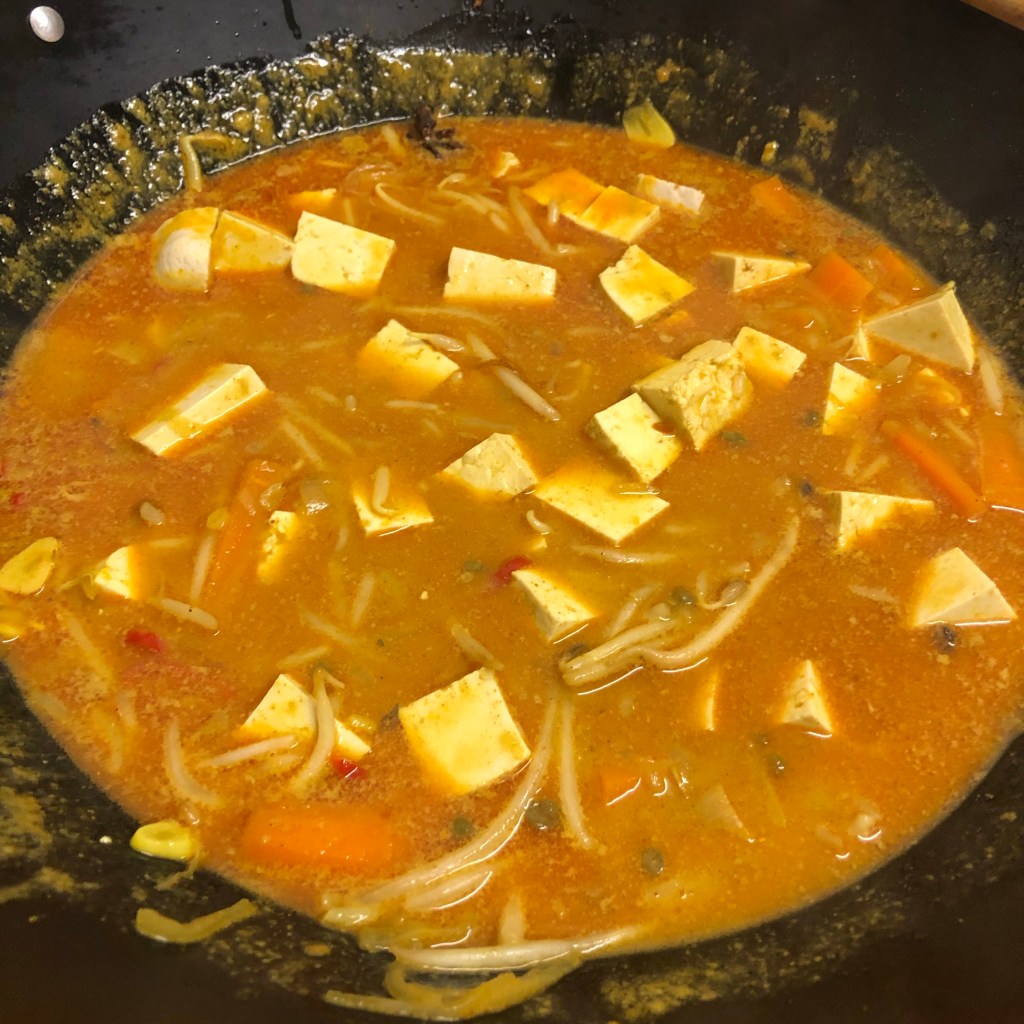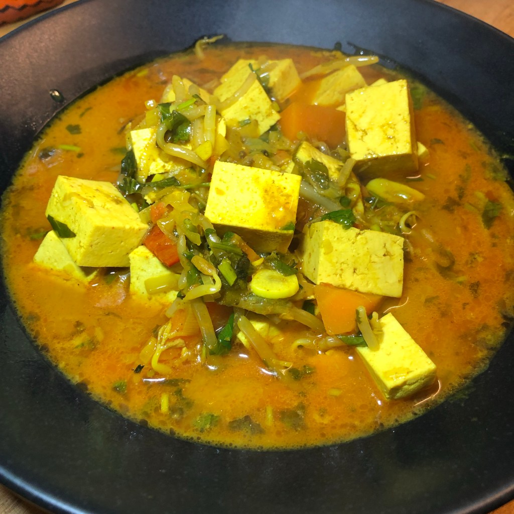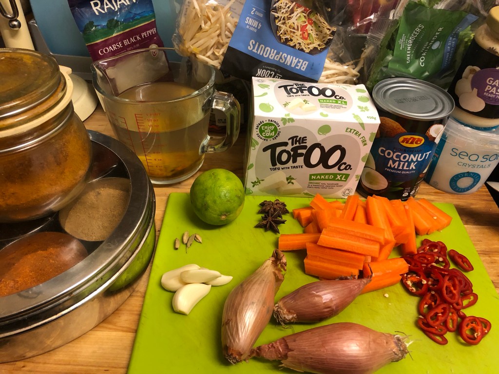 Ingredients- 2 tbsp of groundnut oil, 3 shallots thinly sliced, 4 garlic cloves thinly sliced, 2 red chillies thinly sliced, 1 tsp of turmeric powder, 2 star anise, 1 tsp of galangal, seeds from 4 green cardamom pods, 2 tbsp of curry powder, 400ml of coconut milk, 400ml of vegetable stock, 1 tsp of fish sauce, pack of tofu cut into small cubes, 2 carrots sliced, beansprouts, juice of a lime, sea salt, handful of coriander and an amazing touch – a drizzle of toasted sesame oil to serve.