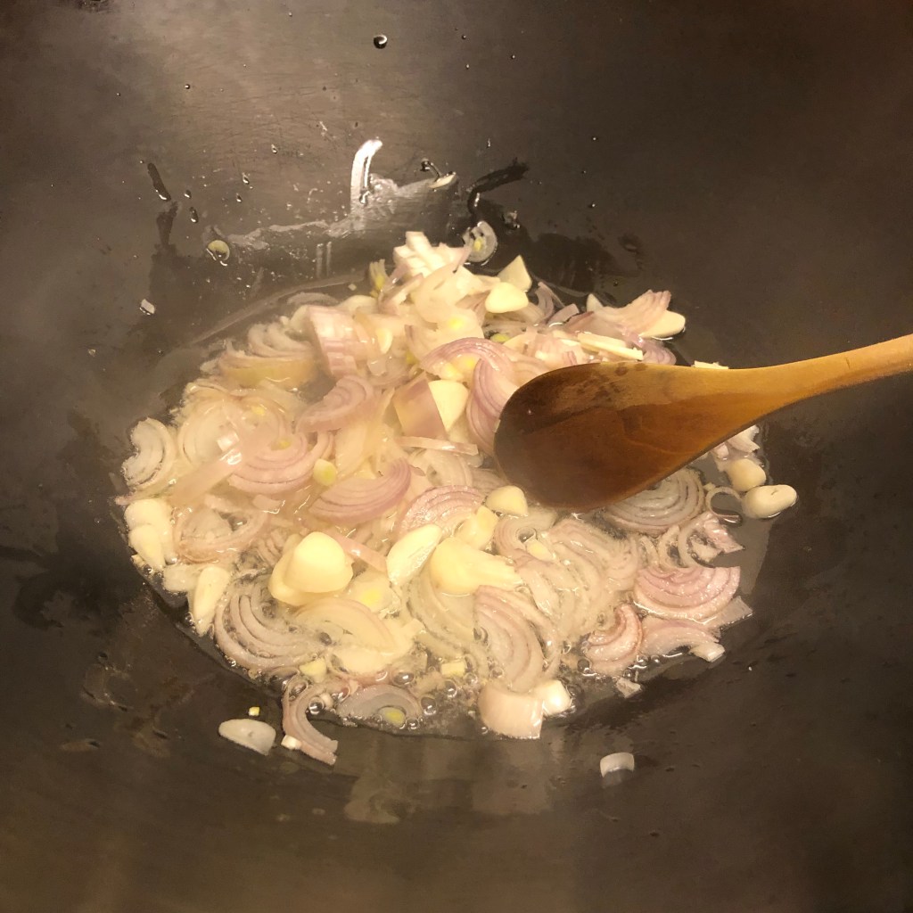 Method – heat a wok over a medium heat. Add the oil to coat the wok. Add the shallots, garlic and pinch of salt stir-frying until the shallots take on a nice colour.