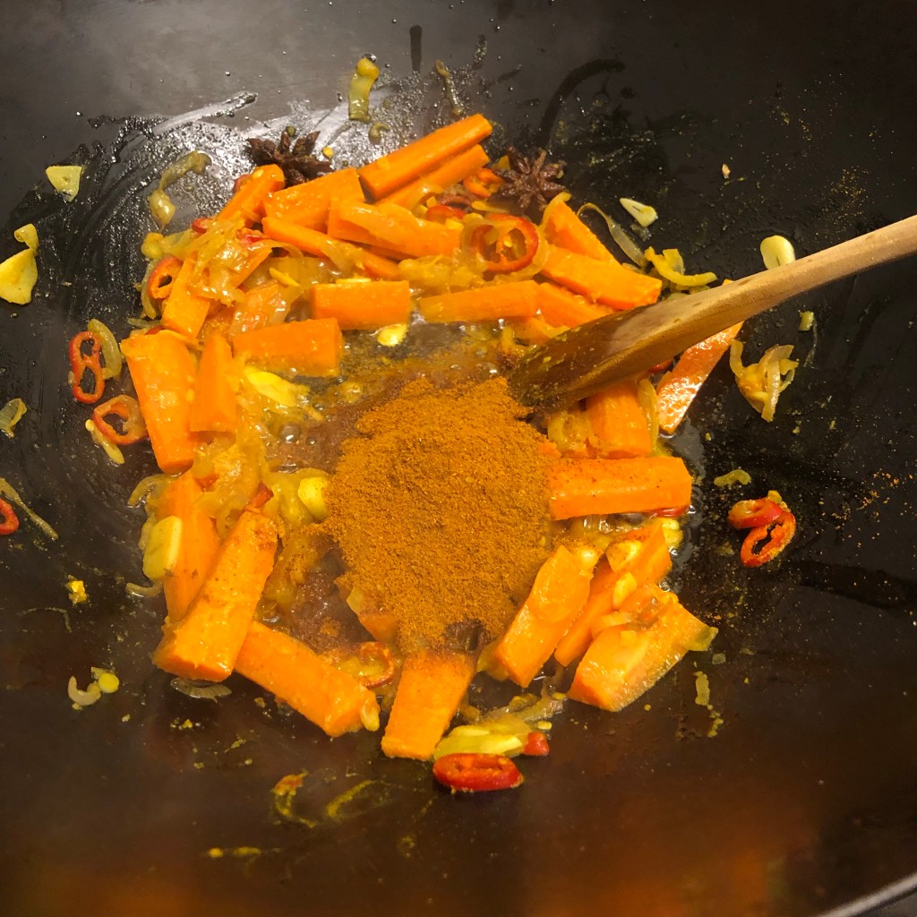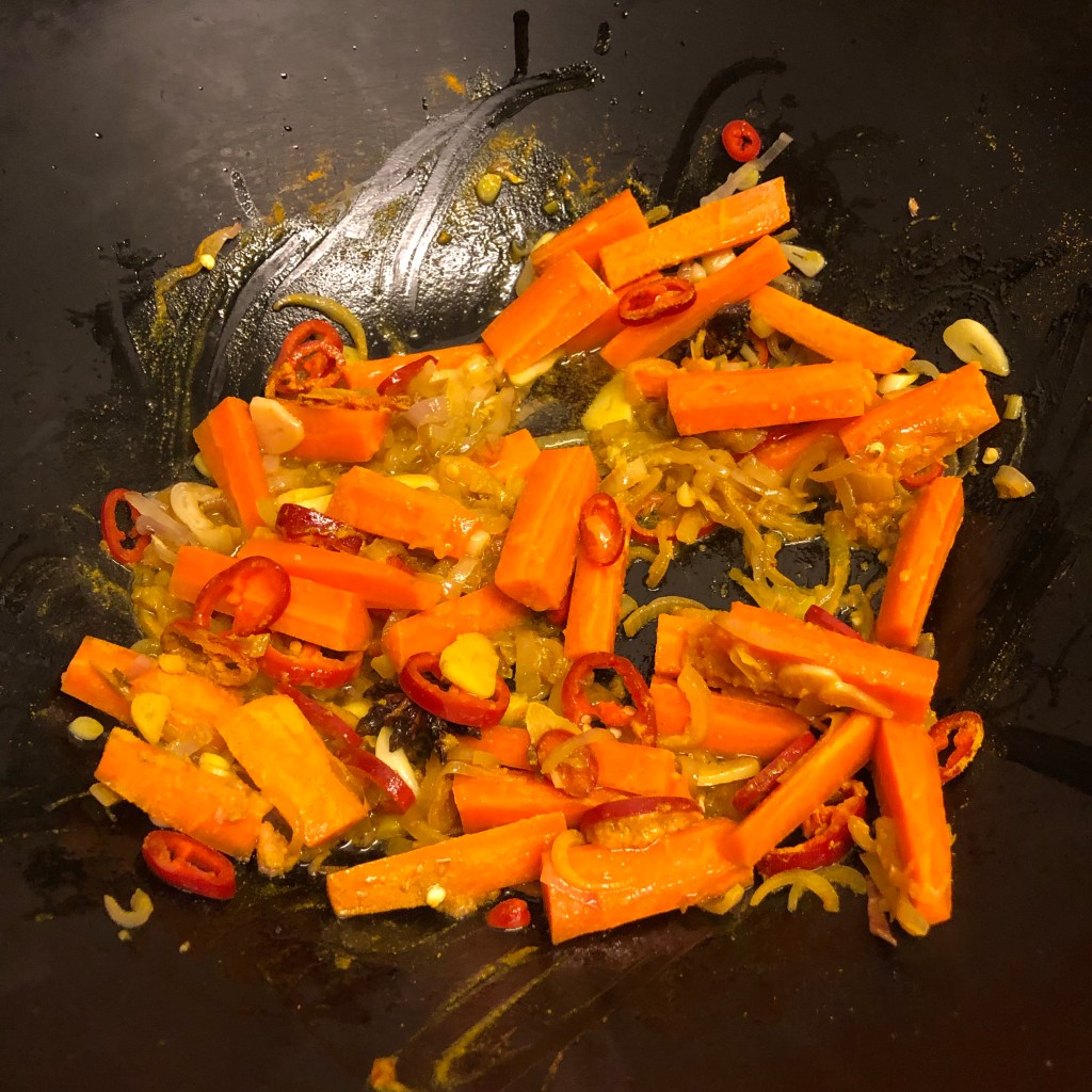 Add the red chillies, carrots, turmeric, star anise, galangal and cardamom pod seeds and stir-fry again for another minute or so.