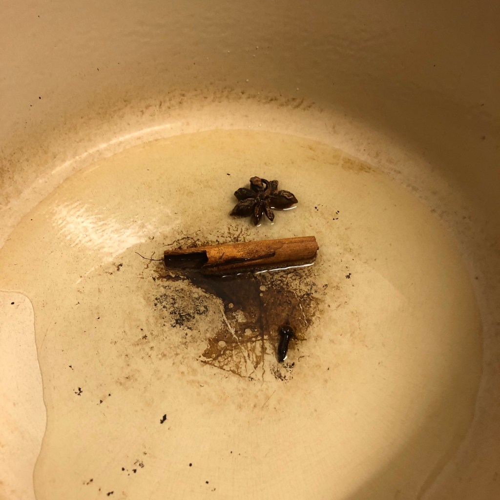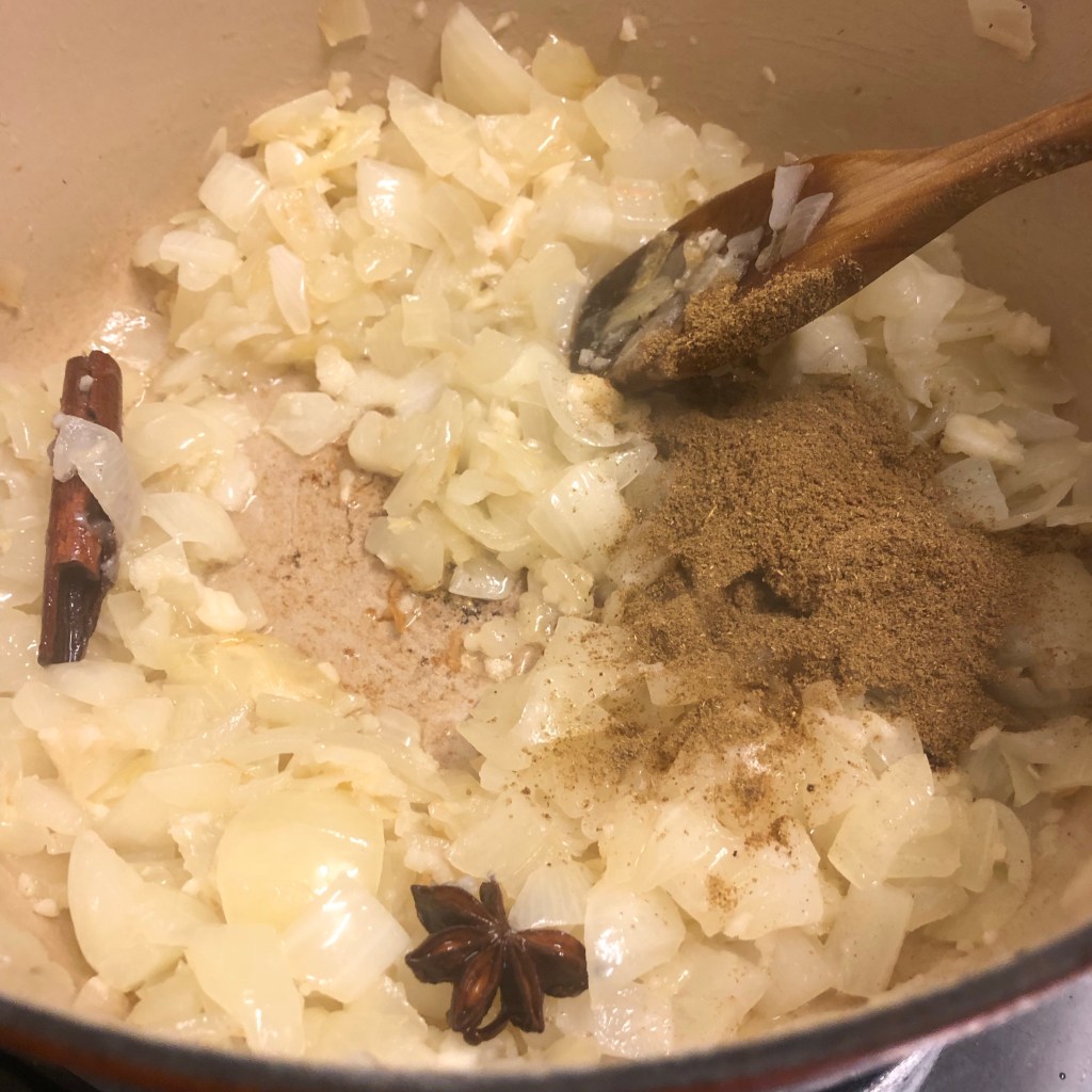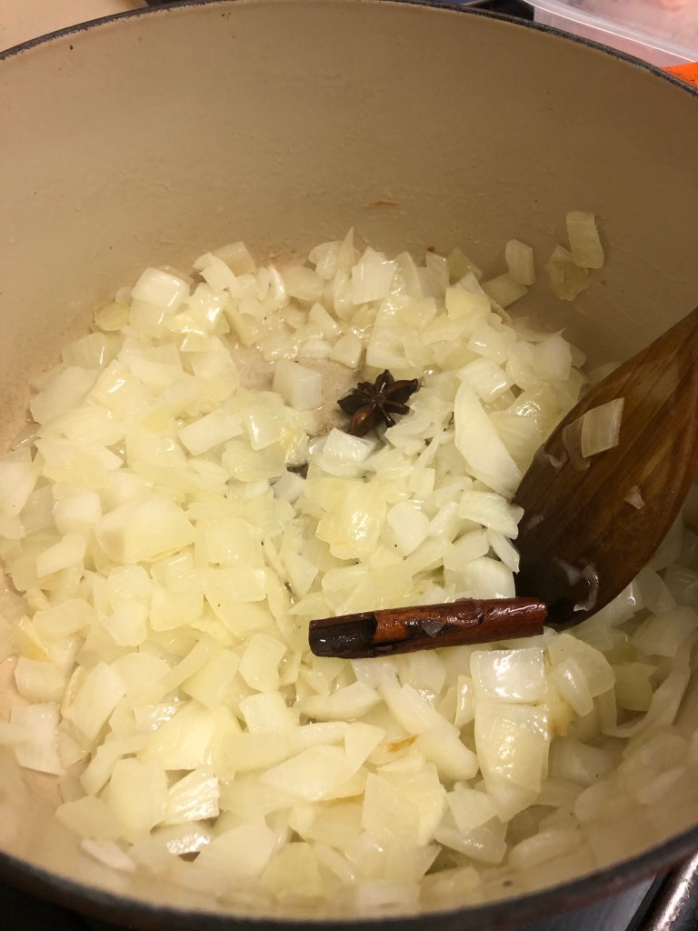 Method – heat the oil in a heavy pan. Once the oil is hot add the cinnamon stick, star anise & clove allowing them to flavour the oil for a minute or so.