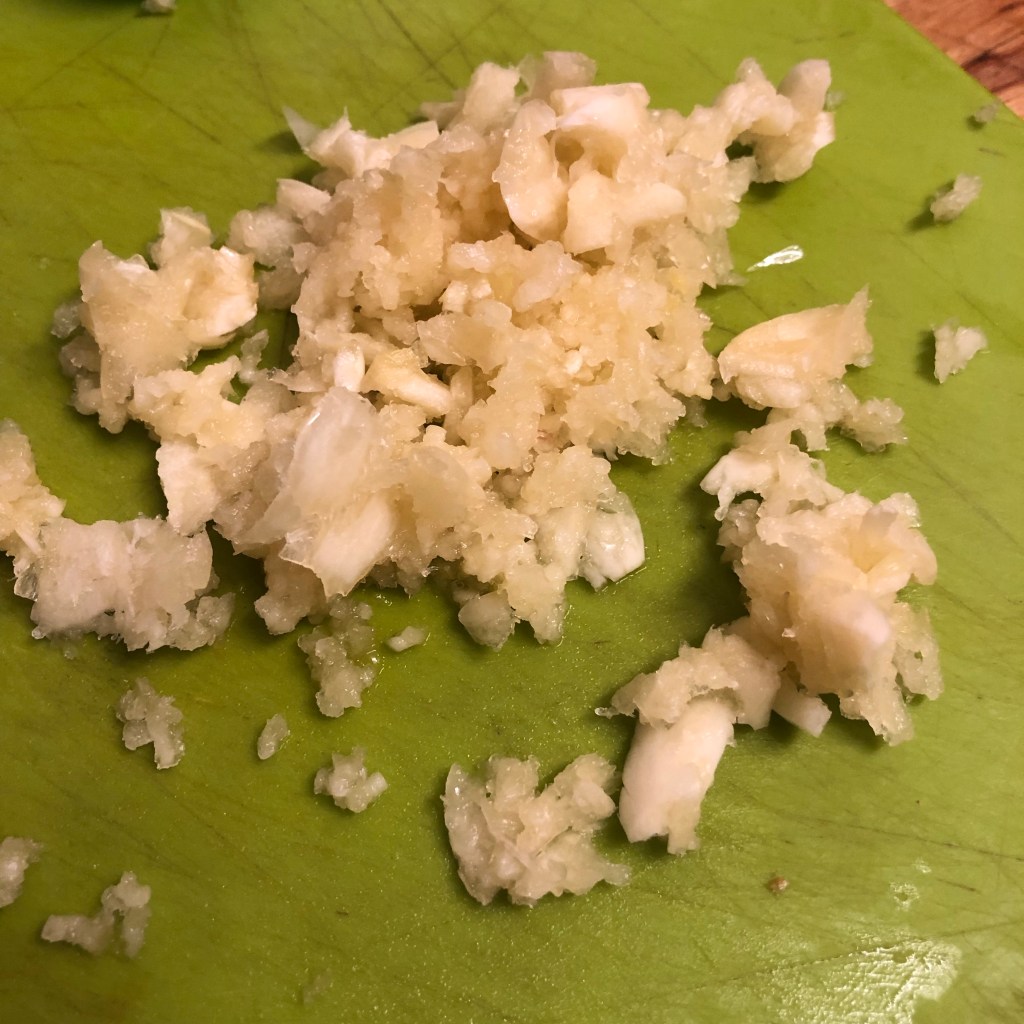 Crush the garlic cloves then after 15 minutes of the onions cooking away add the garlic & cumin powder. Stir this for 2 minutes coating the onion.