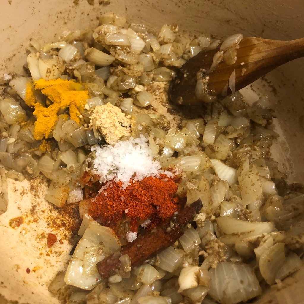 The smell at this point was amazing. The dish was coming together naturally. Whilst this was cooking I made a dhal. I’ve used the same method for my dhal for years and it’s so simple. Hot oil in a pan, add cumin seeds and couple of cardamom pods and fry these until the cumin seeds pop. Add 1/2 a diced onion and a tsp of turmeric then fry for a couple of minutes. Add the orange lentils and coat them in this mixture. Add double the amount of water to lentils, lid on the saucepan and simmer removing any scum off the surface.