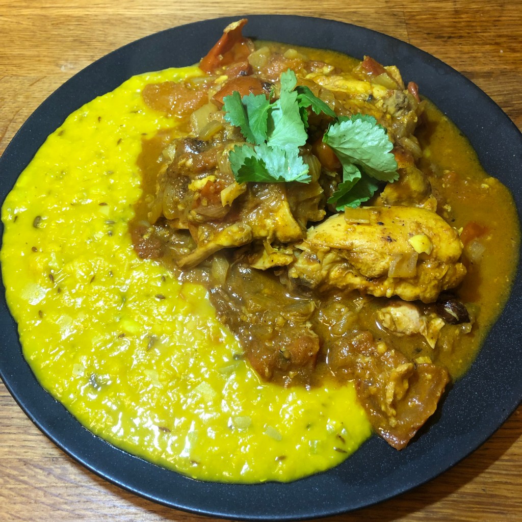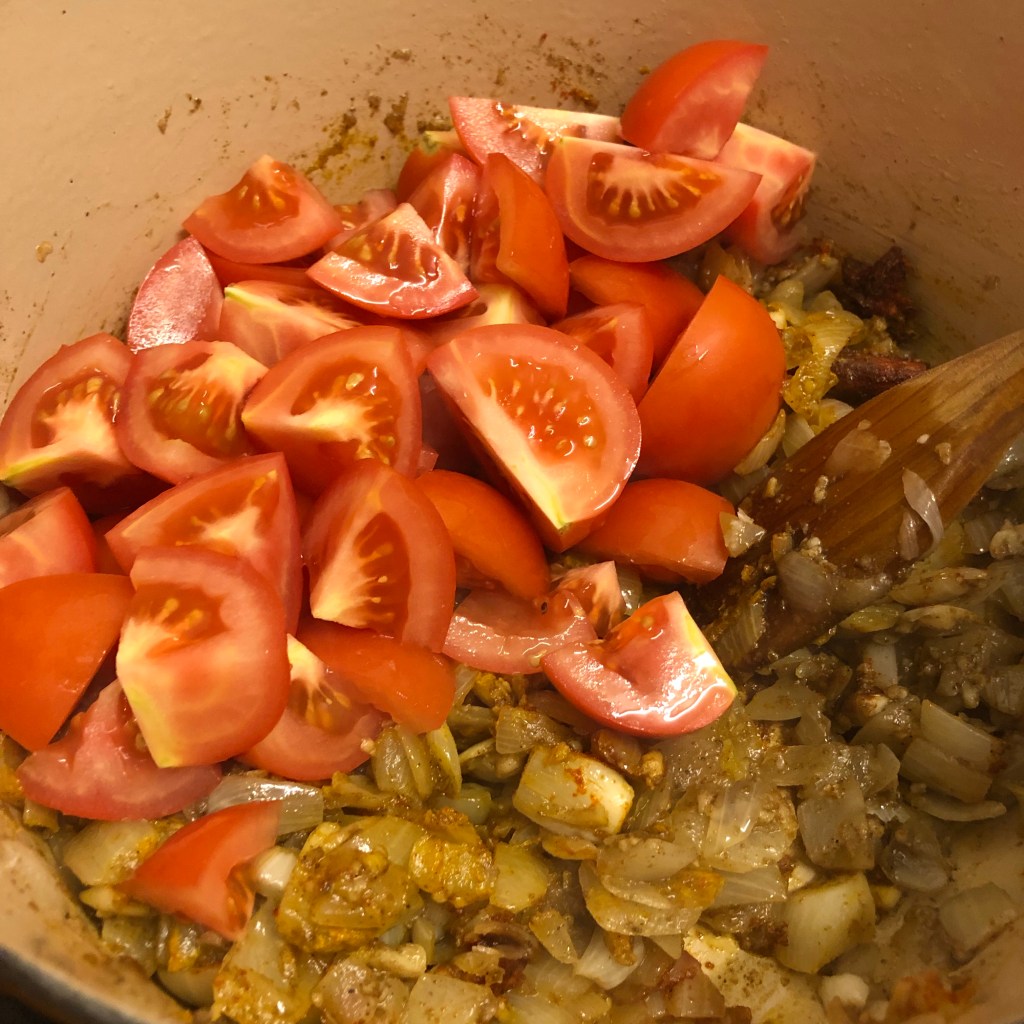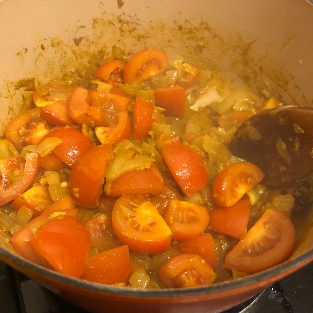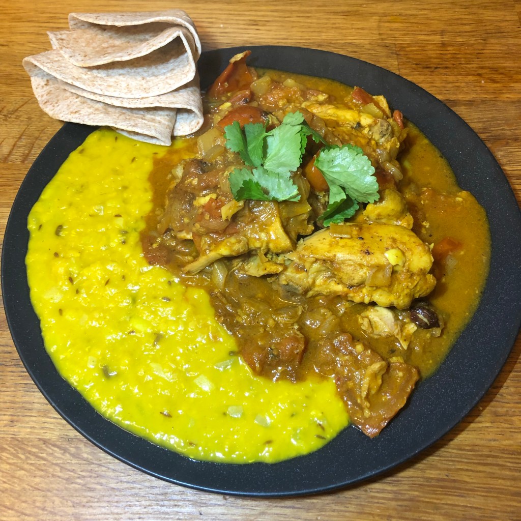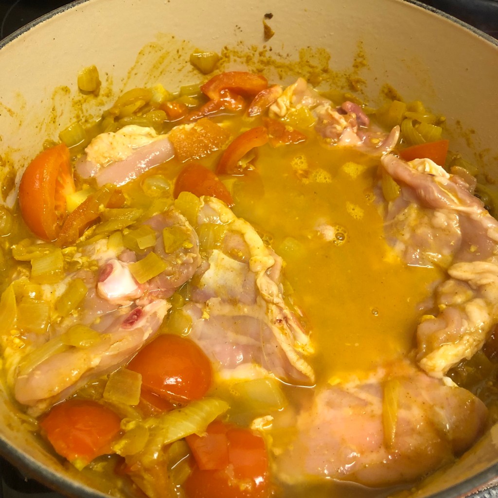 A few reasons I was drawn to this recipe – 1. a cheap dish to make as I only needed to buy the chicken thighs on the bone which as you know is a cheaper way to purchase chicken plus thighs are the best for flavour. £3.45 for 1 kilo. I also had to purchase tomatoes but I had everything else in the house. 2. It was a one pot dish which I’m drawn to as it’s easier to clean up as you go along. 3. After a mentally draining week due to the few ingredients needed it wasn’t a taxing dish to create.