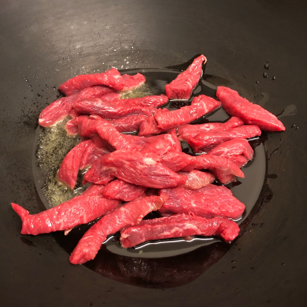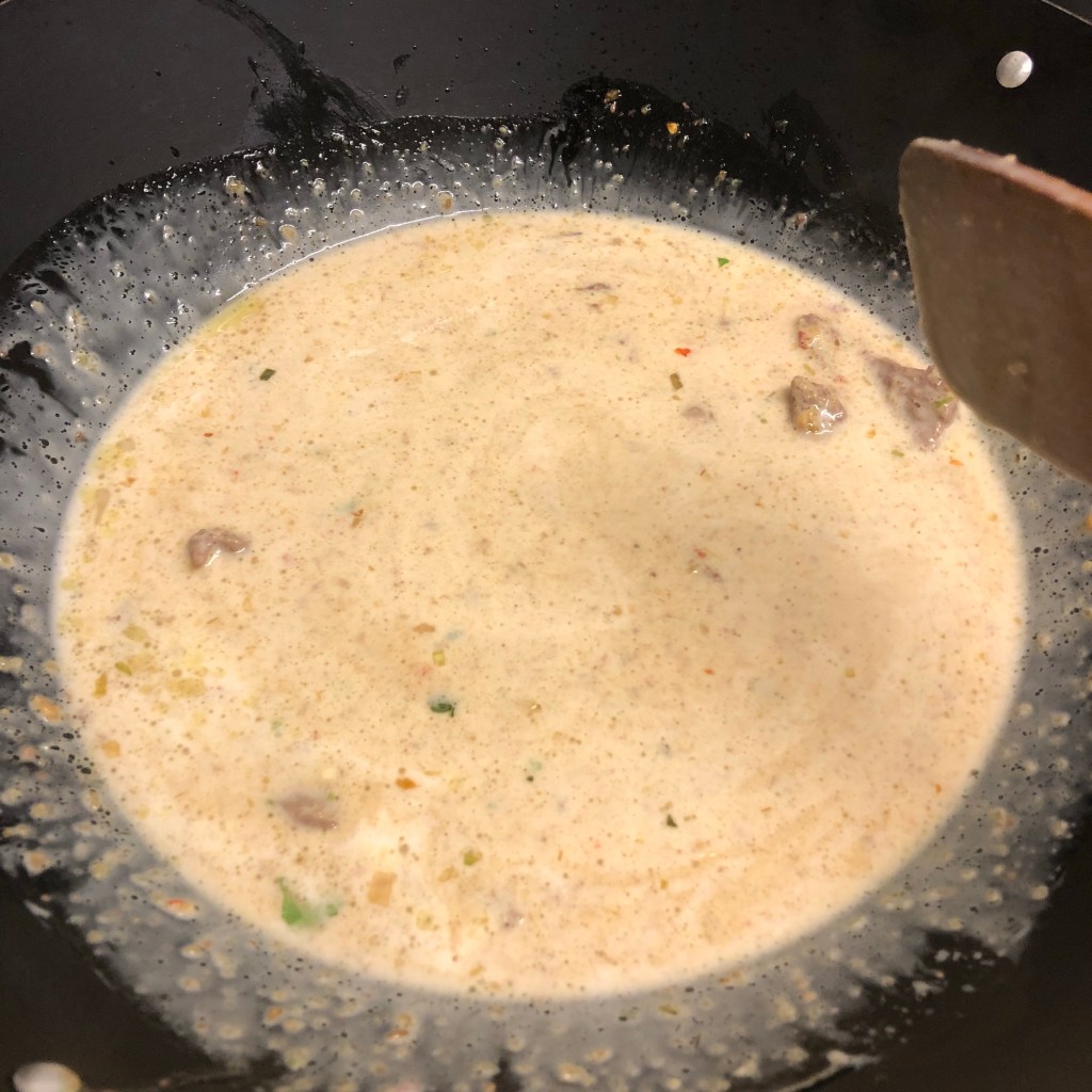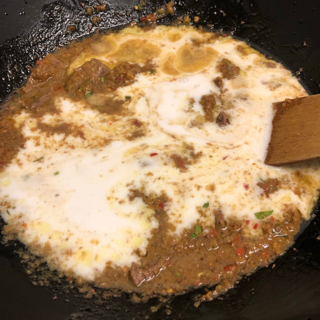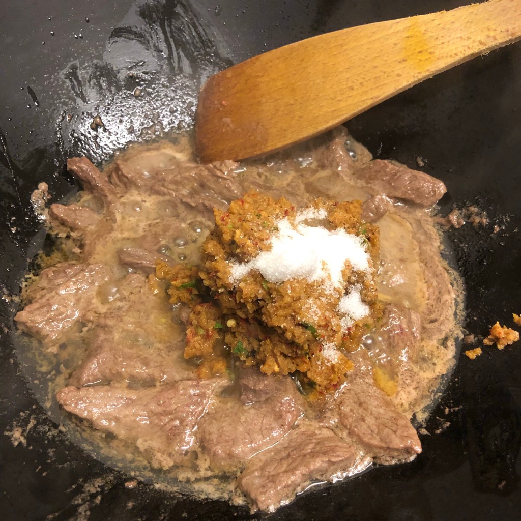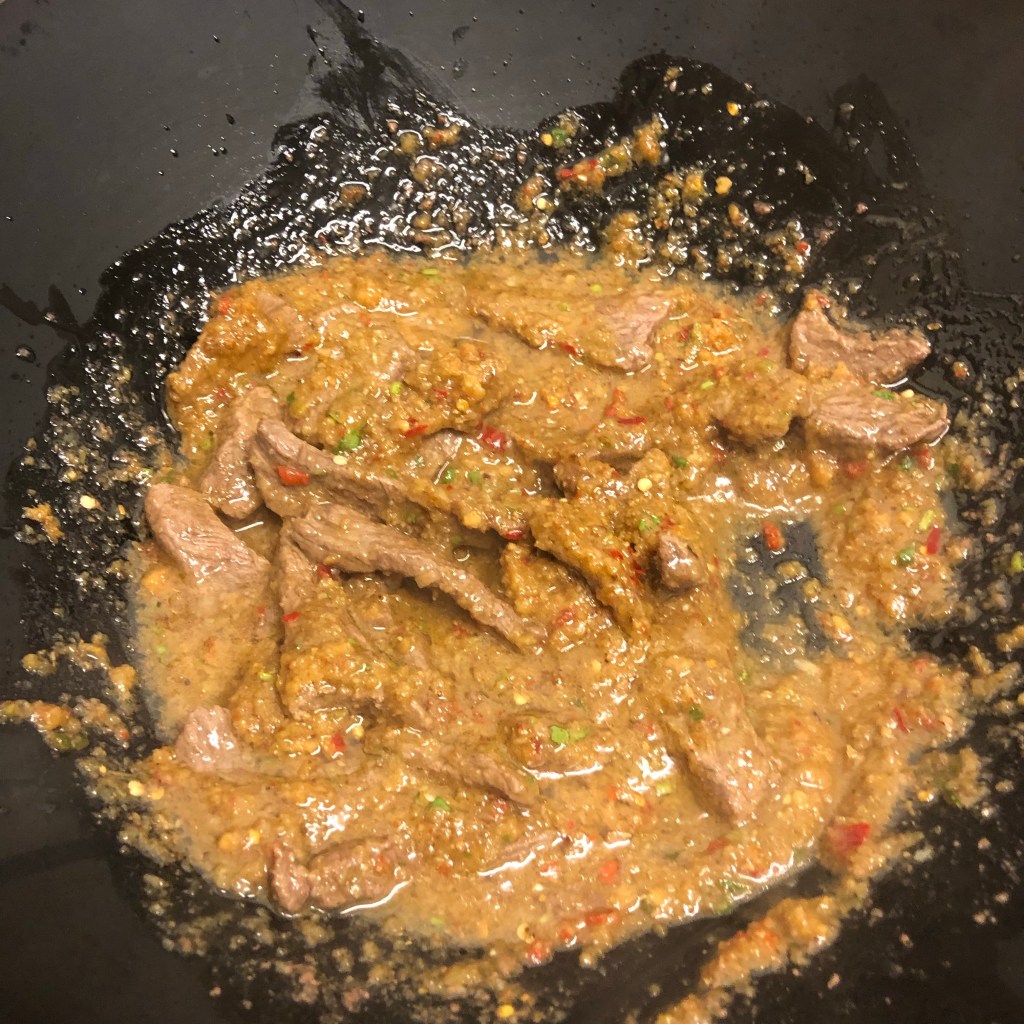 Once you’ve browned the meat add it all back to your wok along with the pre-made paste.