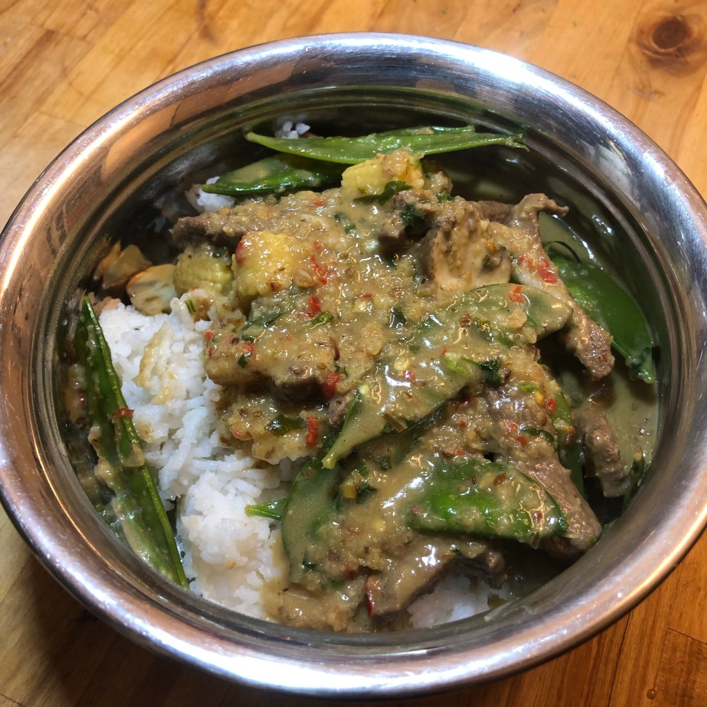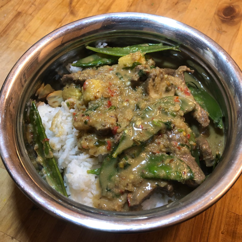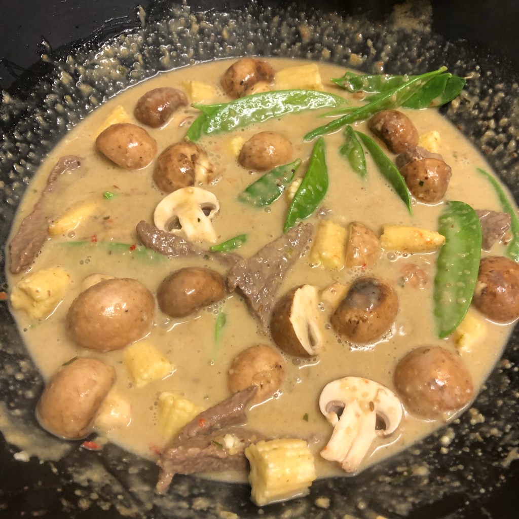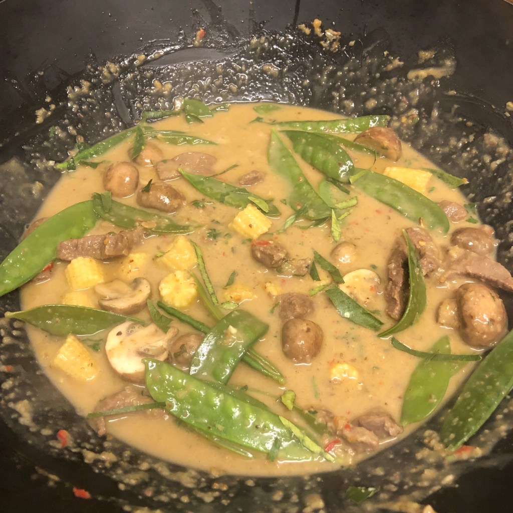 Ingredients- 2 tbsp rapeseed oil, 600g of beef, 1 batch of pre-made panang paste, 1 tbsp of palm sugar, 400ml tin of thick coconut milk, what ever vegetables you want to add – I used mangetout, mini corns and mushrooms which all needed using, kafir lime leaves, 2 tbsp of fish sauce.