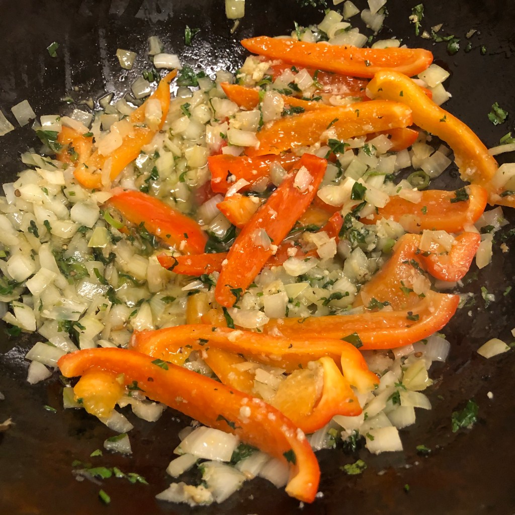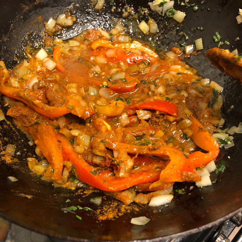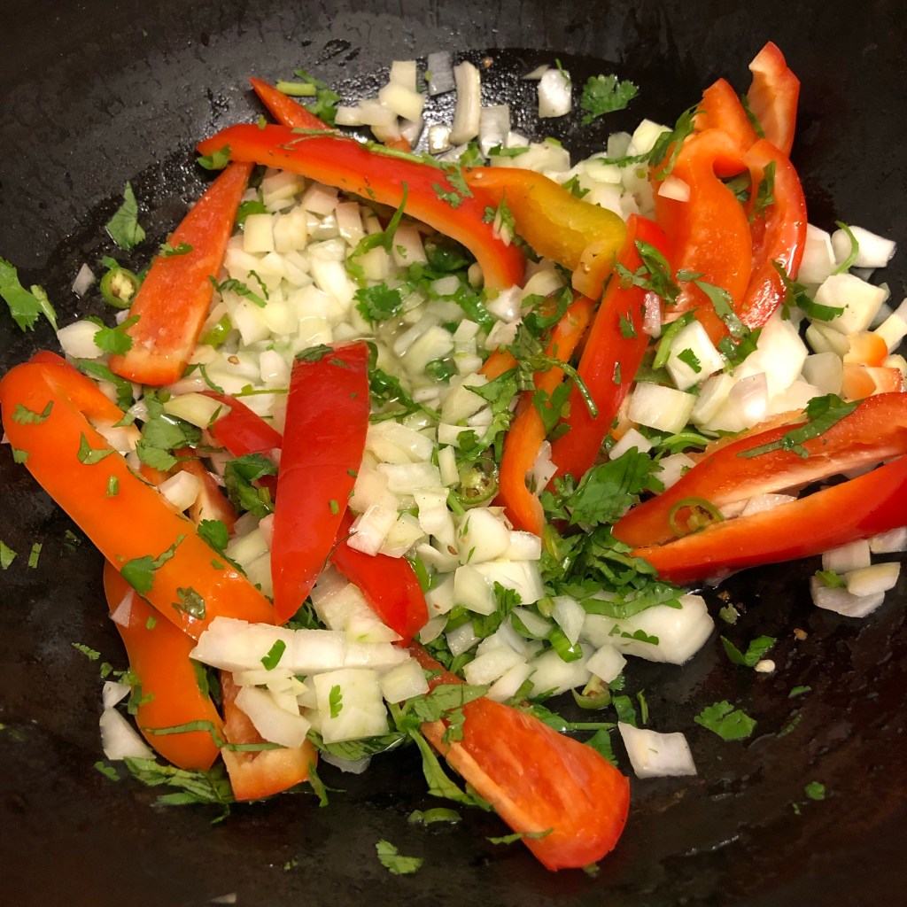 Then in my Karahi pan the rapeseed oil was heated, once nice and hot add the diced onion, coriander stalks, green chillies and chunks of red pepper and fry in the hot oil. Allow this to cook for a few minutes but they must retain their crunch.