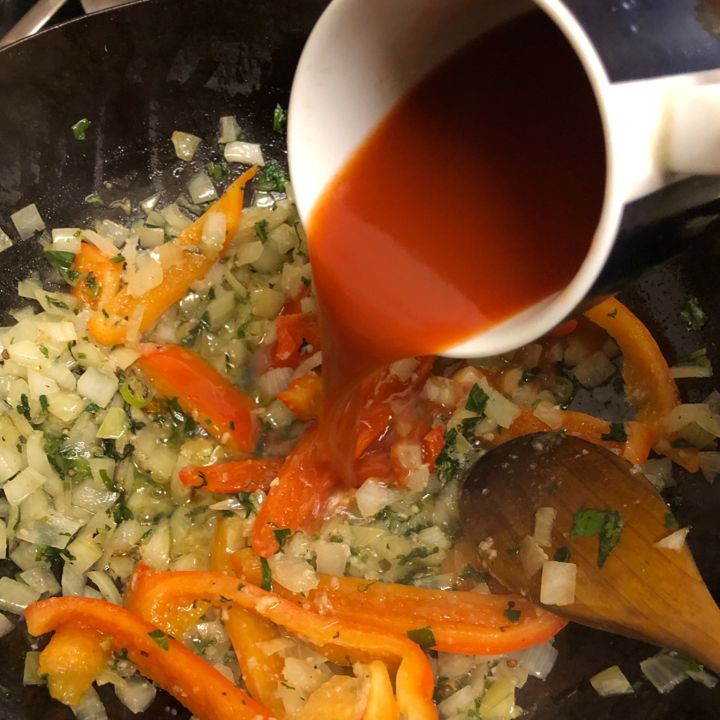 Add the tomato purée mix and stir well coating everything.