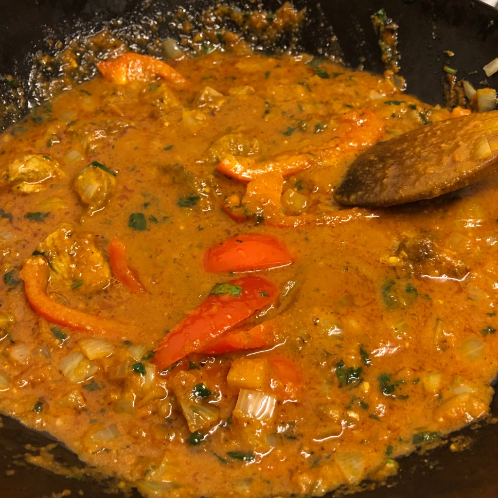 Then again following this quickly add a cup of the base sauce. A quick stir then leave this to come to a quick sizzle. The sauce will nicely caramelise on the sides of the pan, so much flavour is in this caramelised sauce.