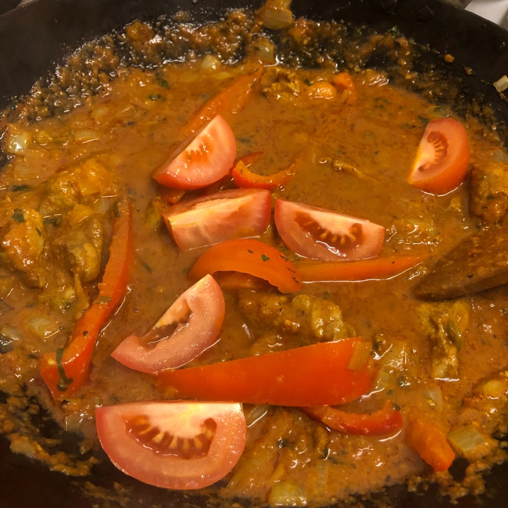 Ingredients- 4 tbsp of rapeseed oil, 1 onion finely diced, 1 red pepper sliced into chunks, 2 green chillies finely diced, 2 tbsp of finely diced coriander stalks, 2 tbsp of garlic and ginger paste, 6 tbsp of tomato purée, 2 cups of pre-made base sauce, 2 tbsp of homemade curry powder, 1 tsp of chilli powder, lamb, 2 tomatoes cut into quarters, salt to taste, 1 tsp garam masala, coriander and green chillies cut in half to serve.