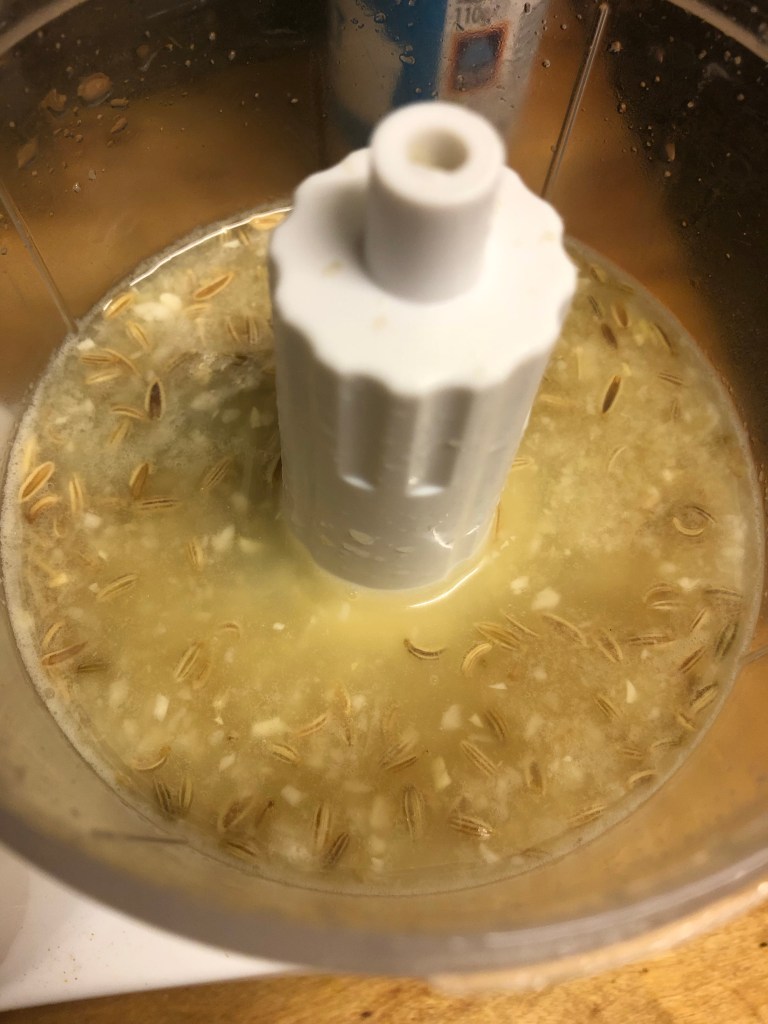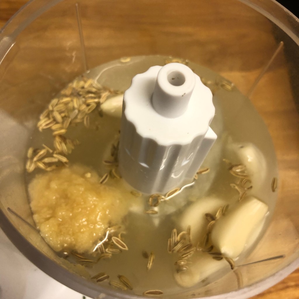 Method – add the ginger paste, garlic cloves, fennel seeds and 100ml of the water to a blender and blitz.