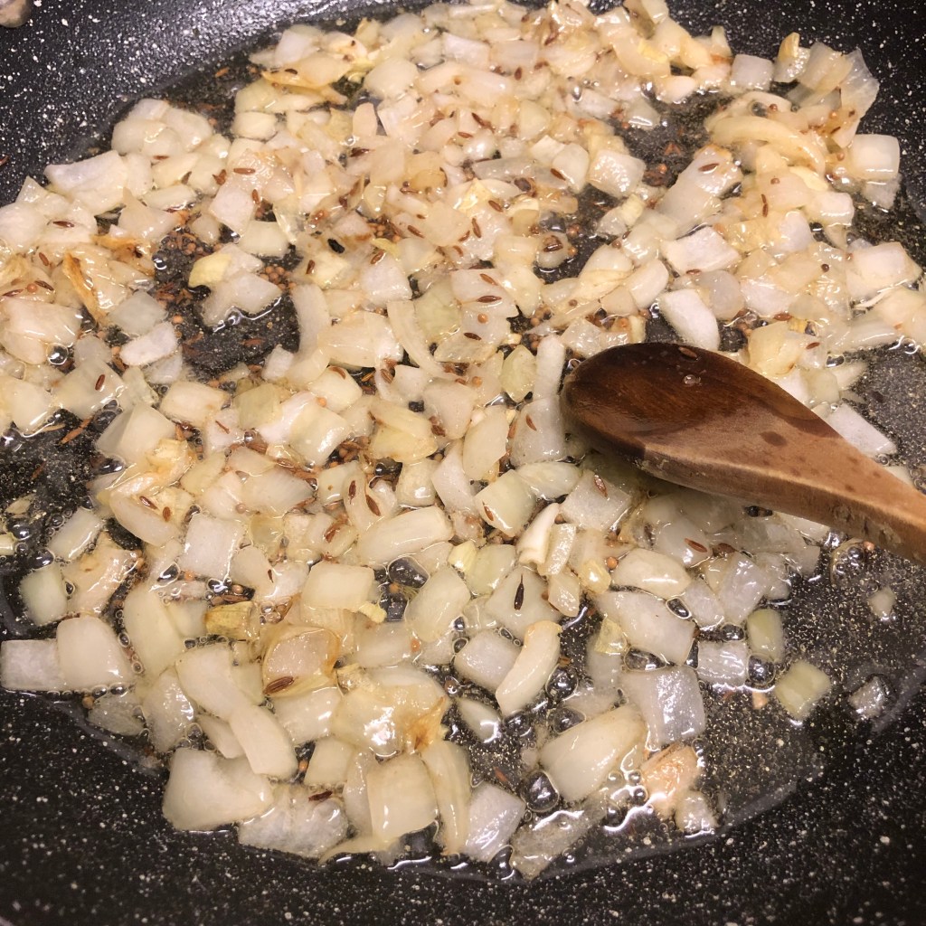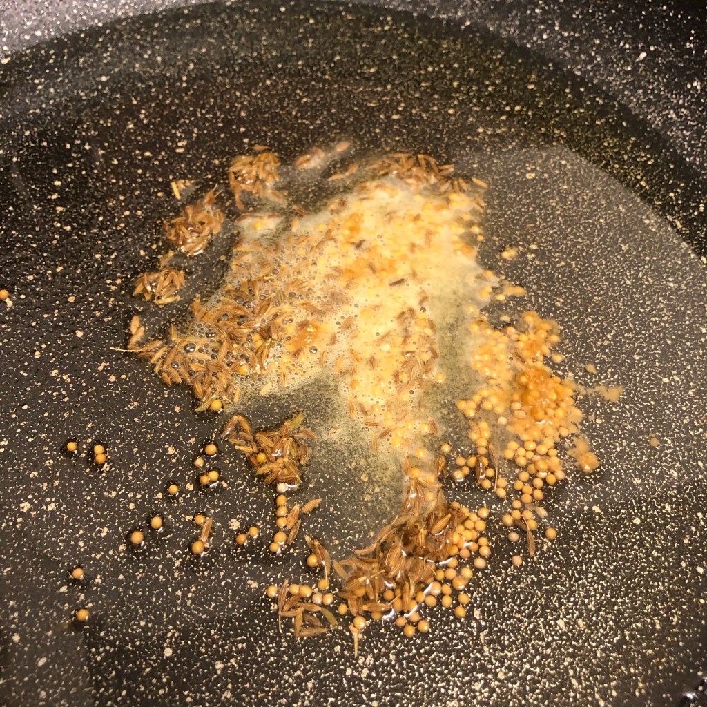 Heat the vegetable oil. Once the oil has become hot add the cumin & mustard seeds. As they sizzle and pop add the fenugreek for 20 seconds and mixing well.