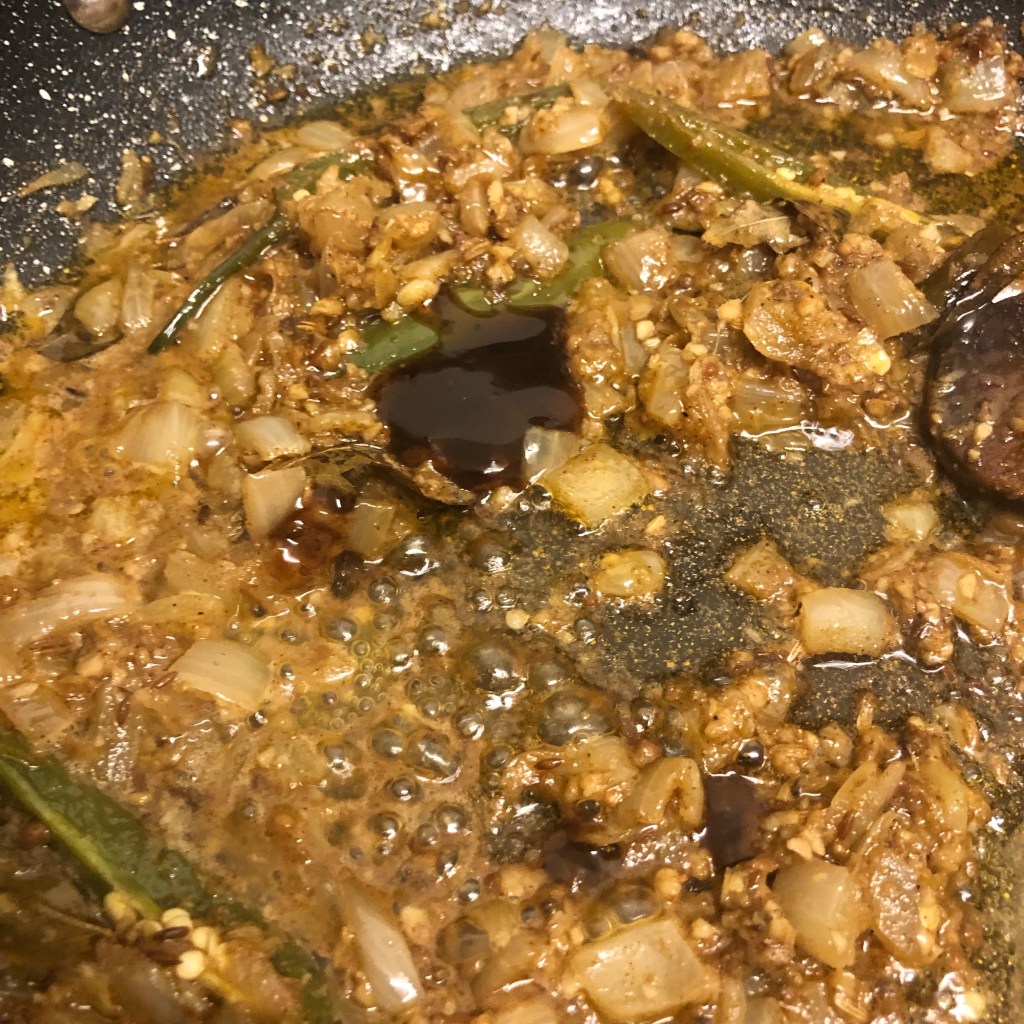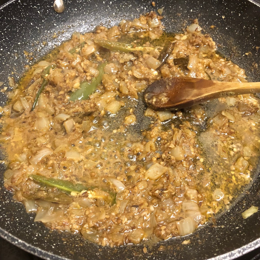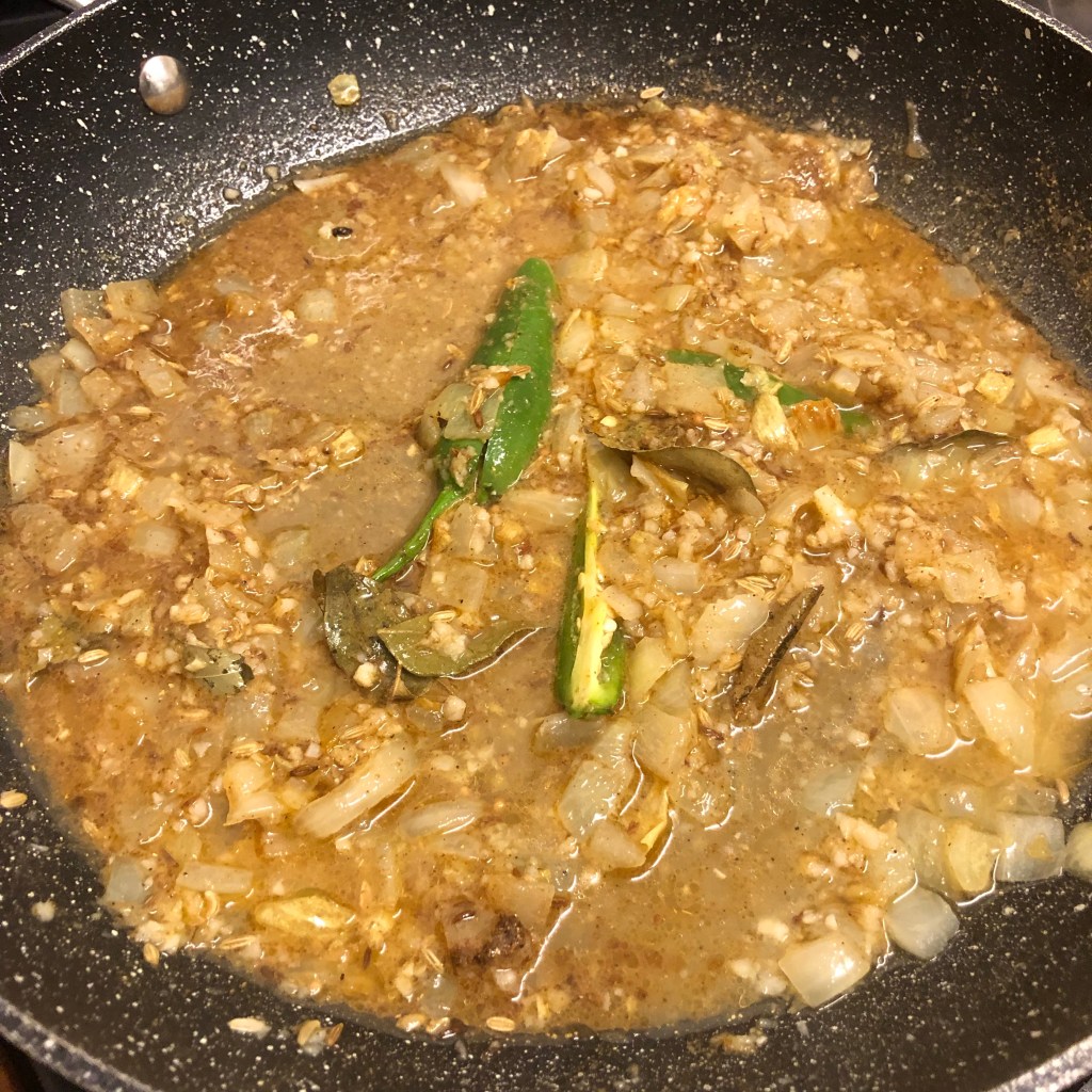 Once the onions have cooked nicely, add the curry leaves, garam masala, coriander, chilli powder, green chillies along with the paste mixture and cook this out for 20 minutes to reduce the paste to almost become a dry mixture. I added a bit more water towards the end as I didn’t want it to dry.