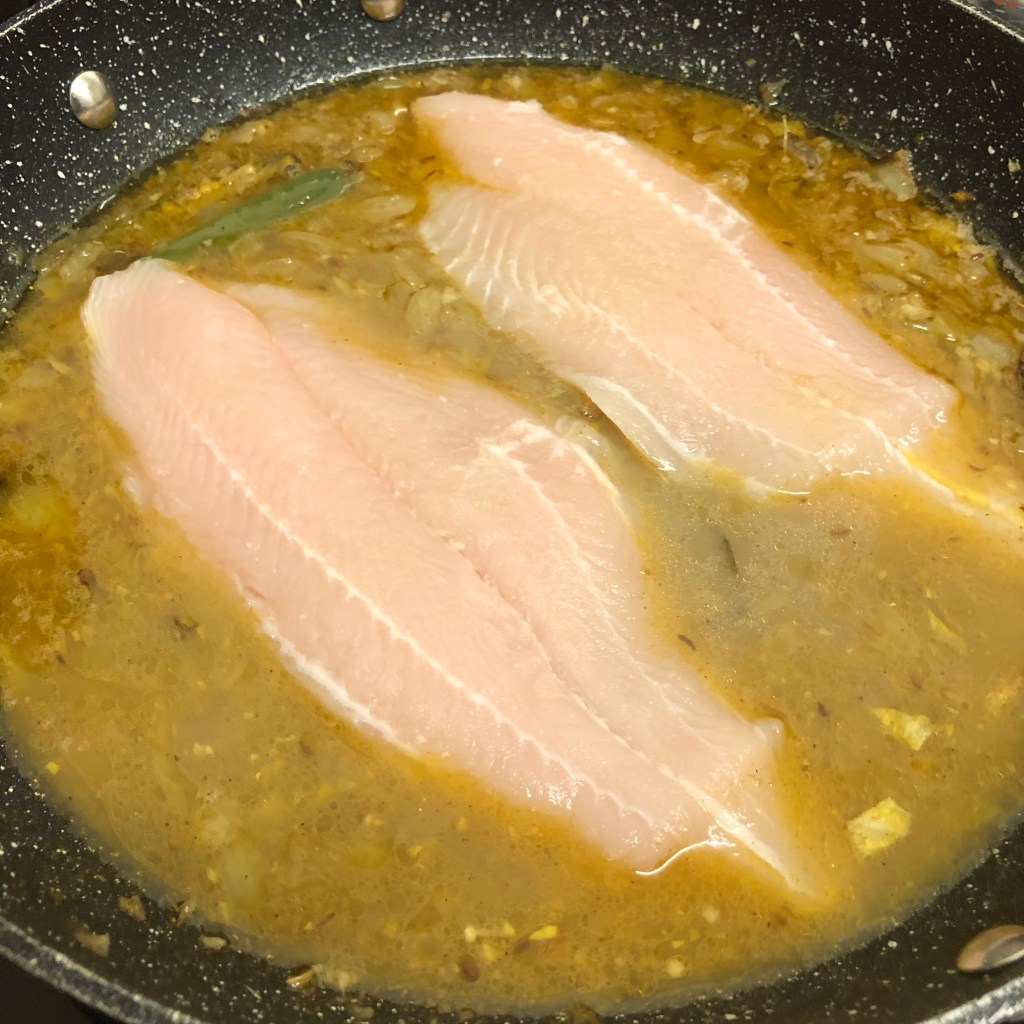 Cooking this for 20 minutes allows all the flavours to come together. Add the tamarind paste stirring well followed by the remaining 200ml of water. I then lay the Basa fillets on top of the sauce to poach them in the spices.