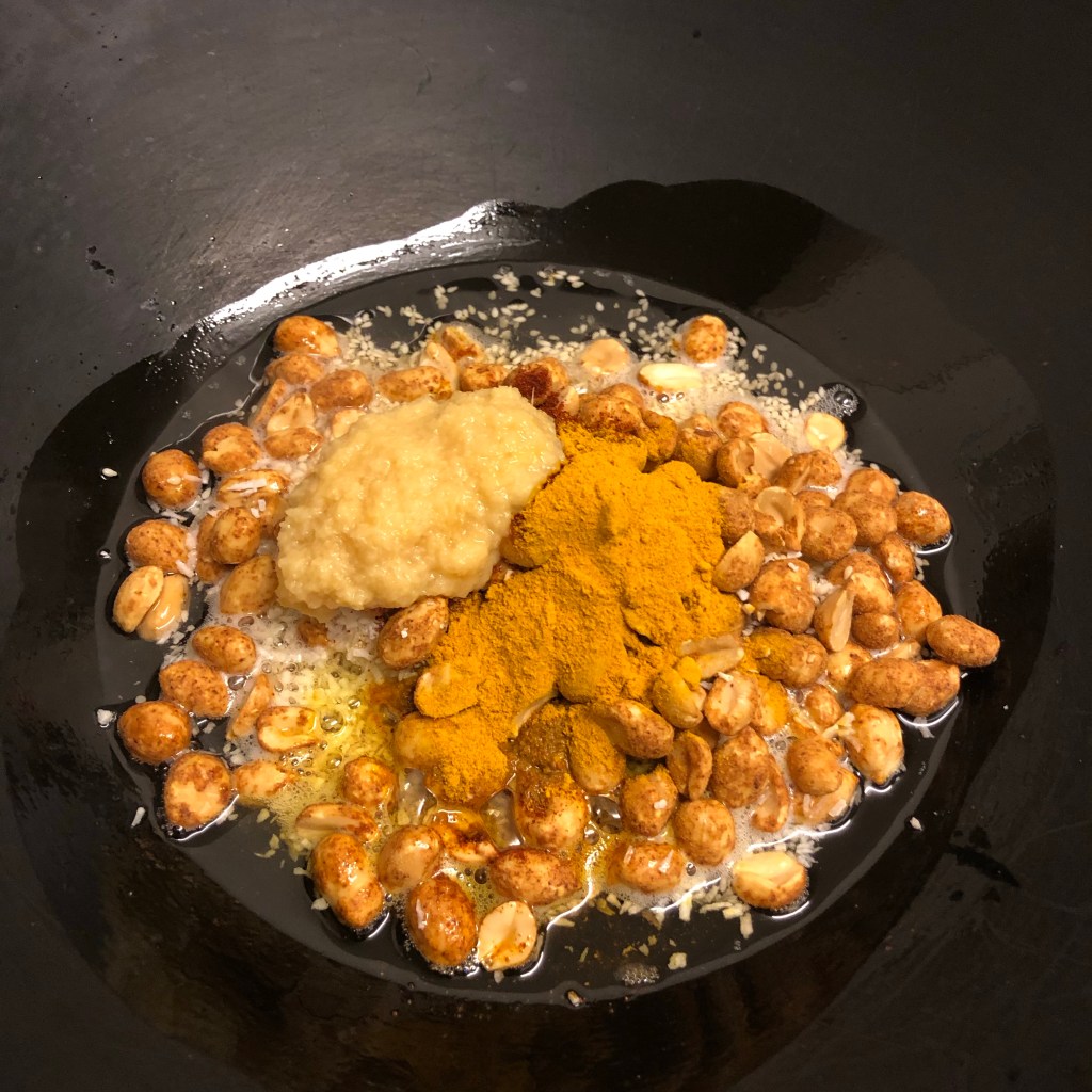 Whilst the broccoli is having a hot bath (as I am whilst I write this up š tmi I know !! ). Heat the coconut oil, I used my wok for speed. When itās visibly hot add in the ginger, coconut, 2 tbsp of sesame seeds, peanuts, chilli powder and turmeric then cook for 3/4 minutes stirring as you go so it doesnāt stick.