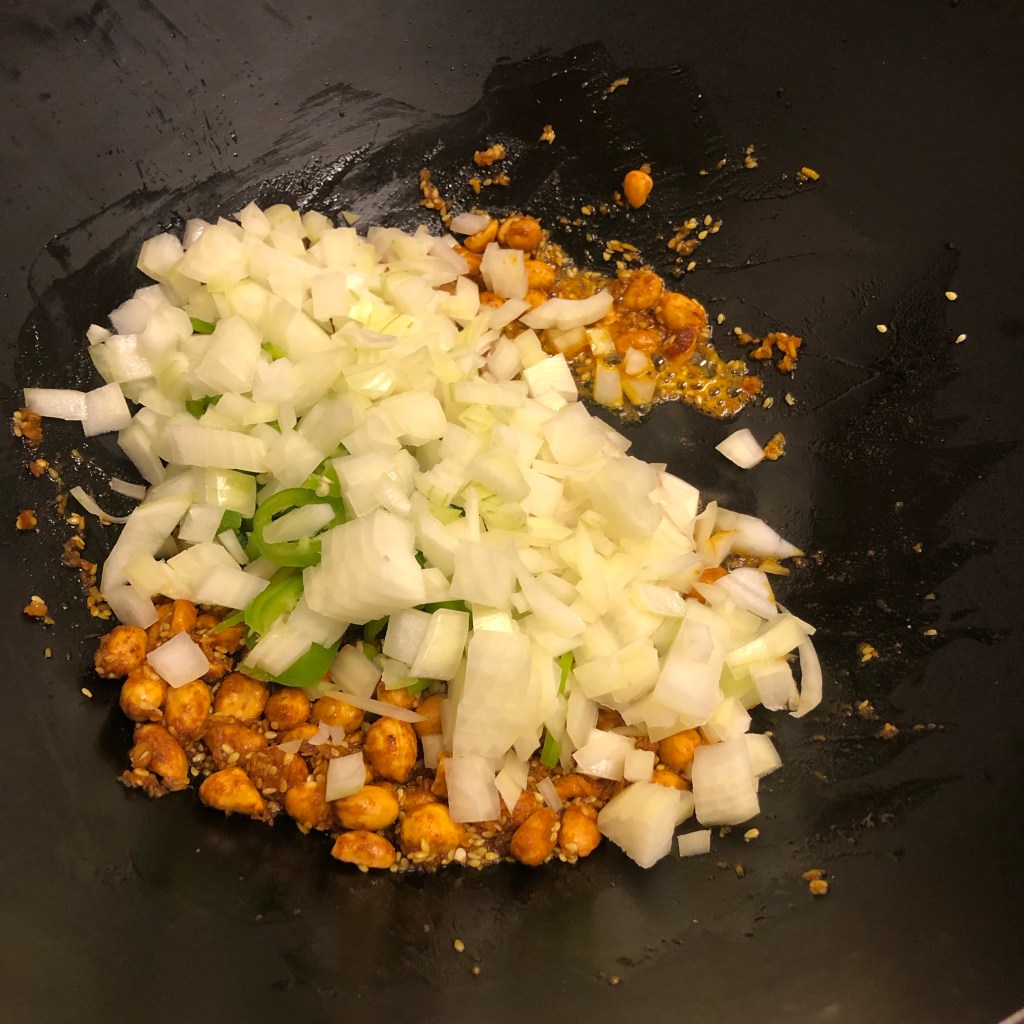 Once the mixture is cooked and become a nice sticky mess stir in the onions and green chillies. Cook the onions for 5 minutes.