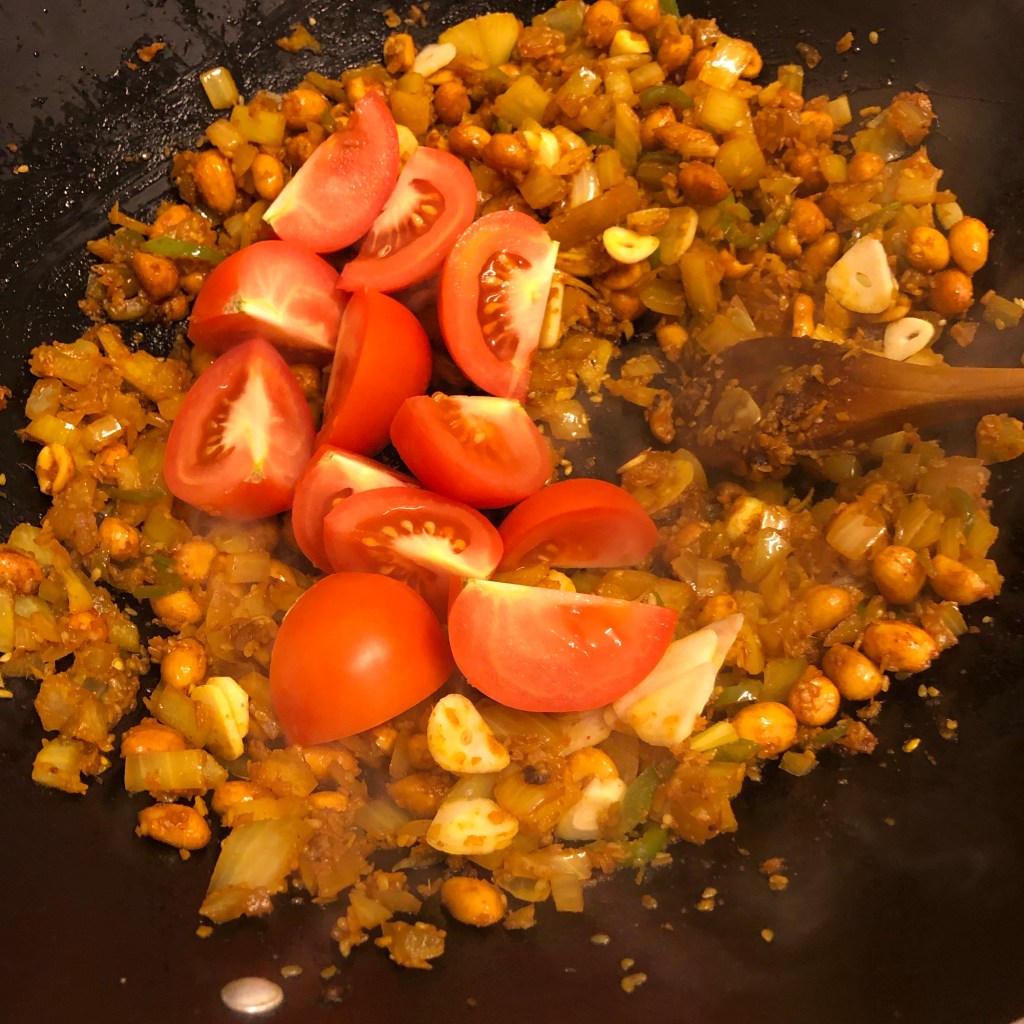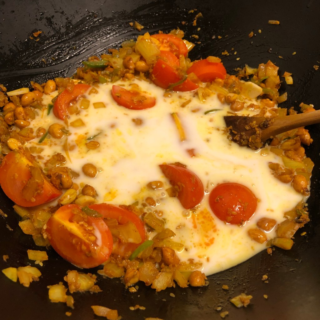 Followed by the tomatoes, par-boiled broccoli and coconut milk.