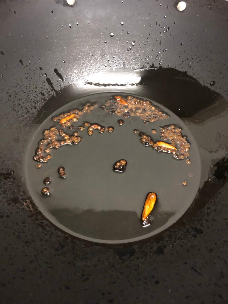 Heat the wok until it’s smoking then add the groundnut oil. Add the Sichuan peppercorns and dried chillies frying for a few seconds.