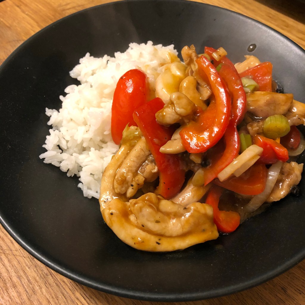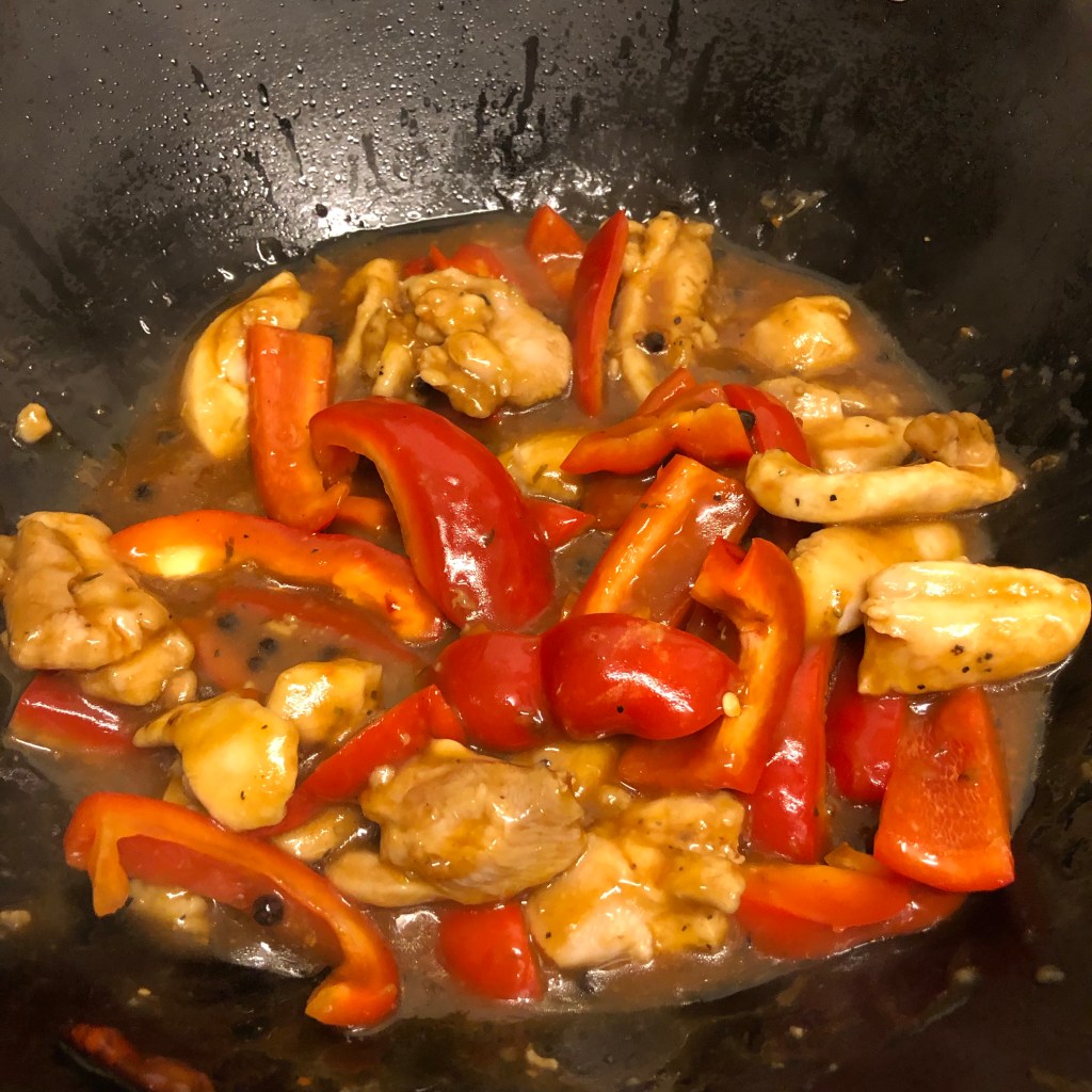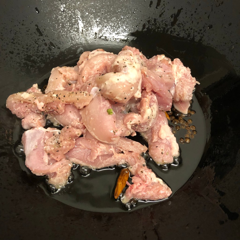 Ingredients- 4 chicken thighs cut into strips, salt and white pepper, 1 tbsp of cornflour, 1 tbsp of groundnut oil, 2 tbsp of sichuan peppercorns, 4 dried chillies, 1 tbsp of rice wine vinegar, 1 red pepper diced, 2 spring onions and a handful of cashew nuts.