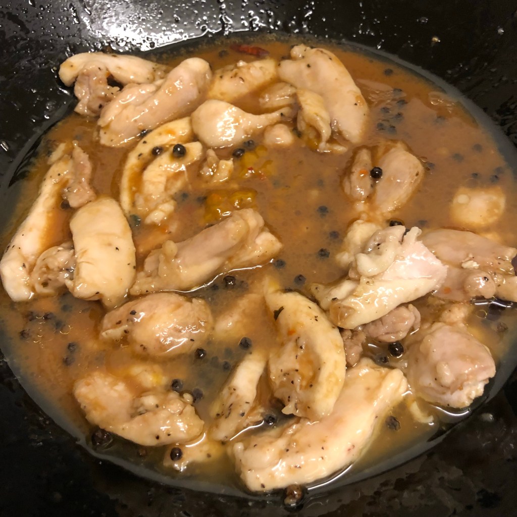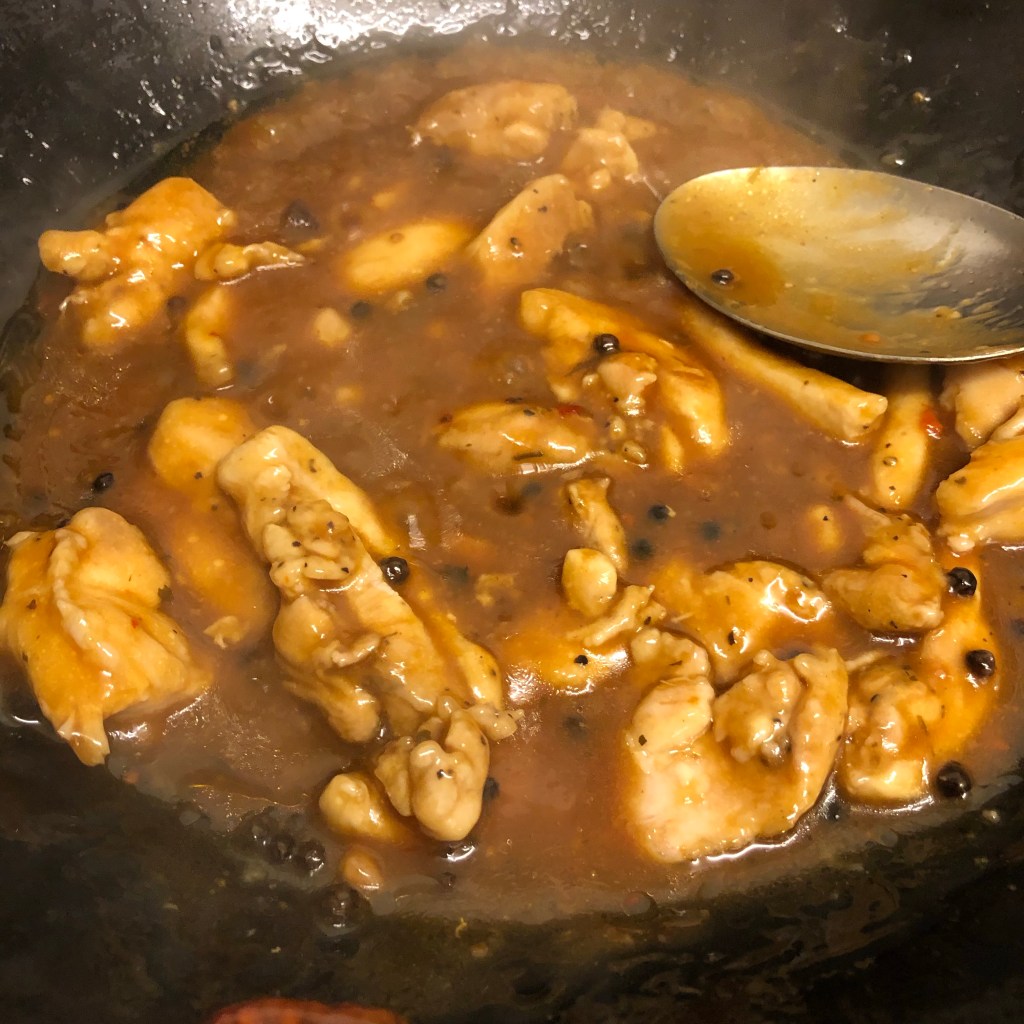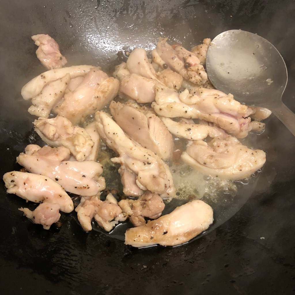 Once the chicken turns opaque add the rice wine vinegar and cook for a further 2 minutes.