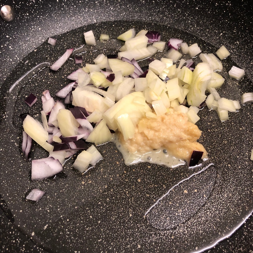 Method – heat the oil in a large pan. When the oils hot add the onion along with the garlic & ginger paste. Fry for a few minutes so it takes on a nice colour.