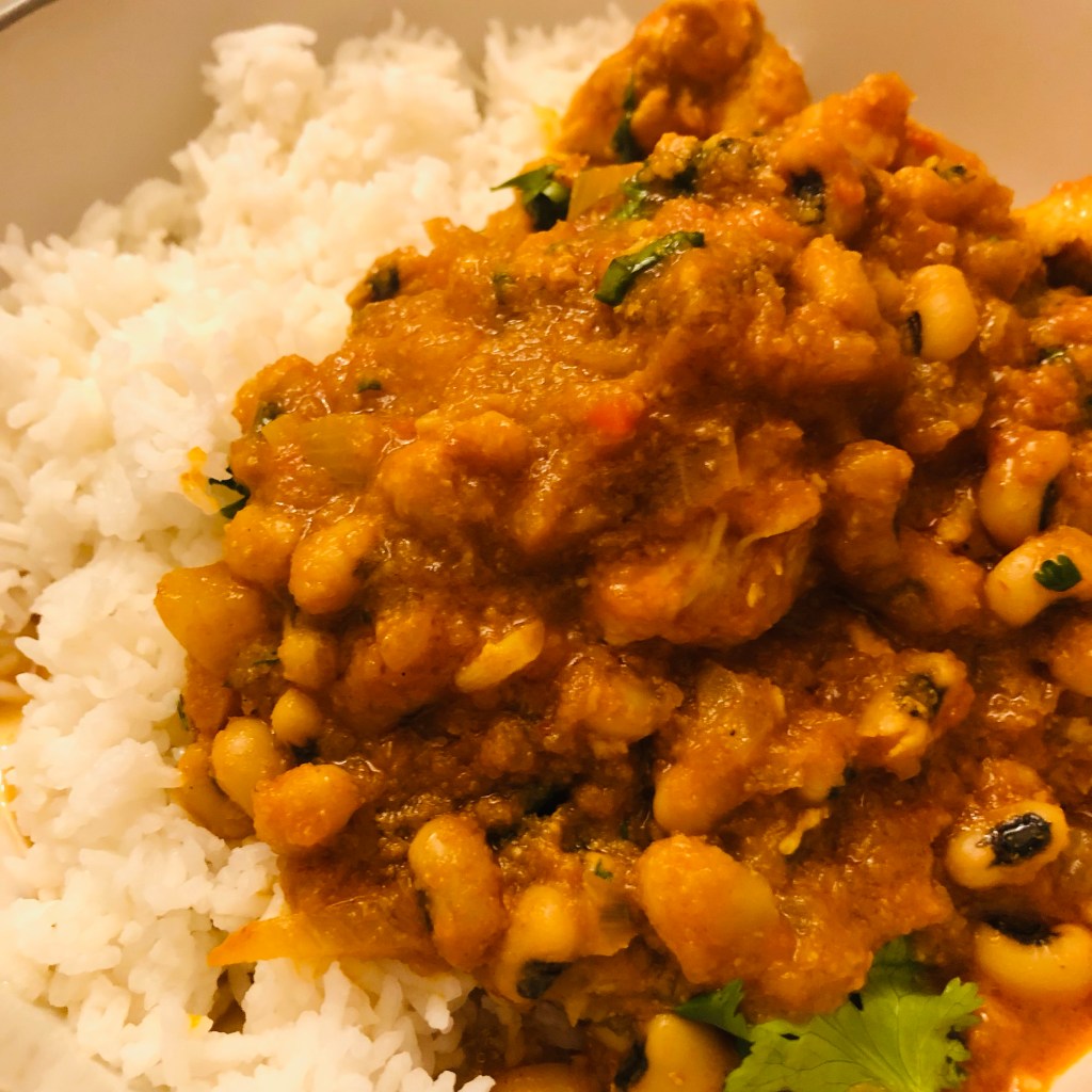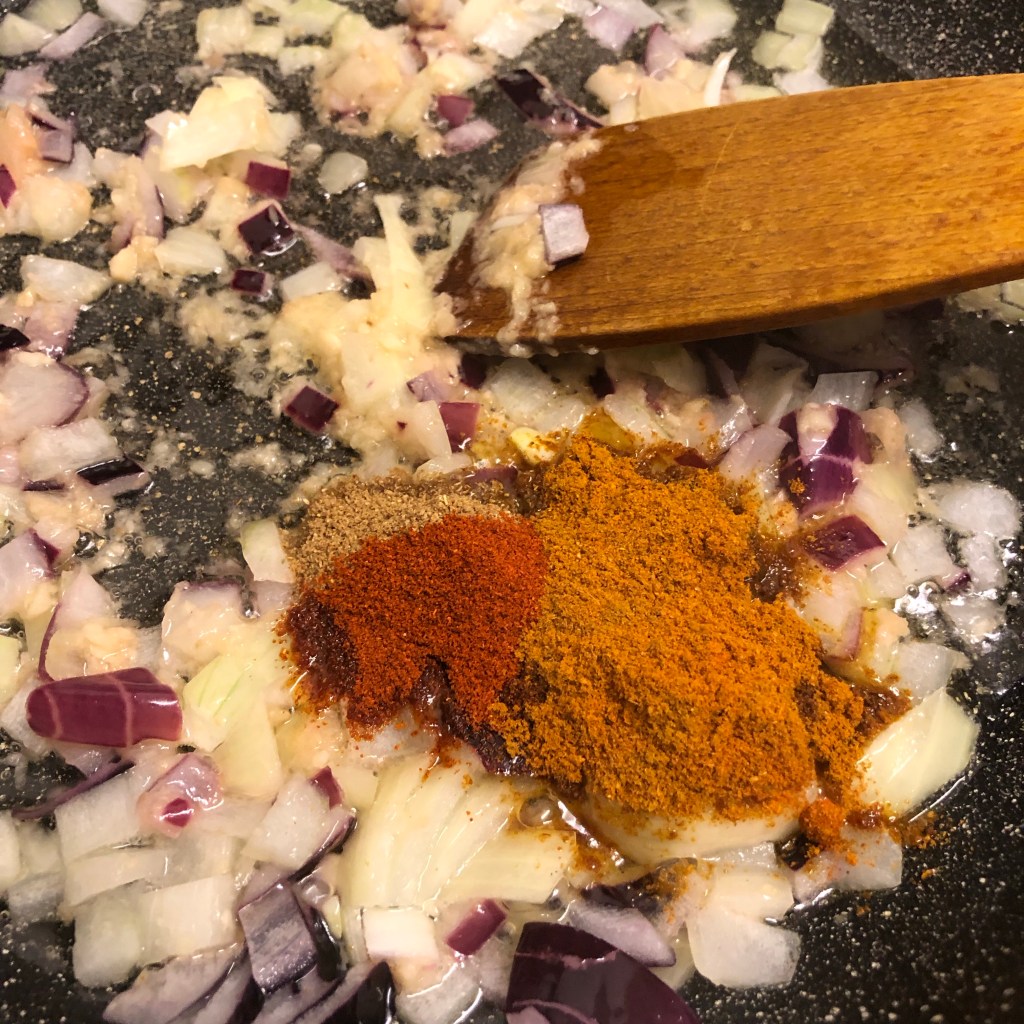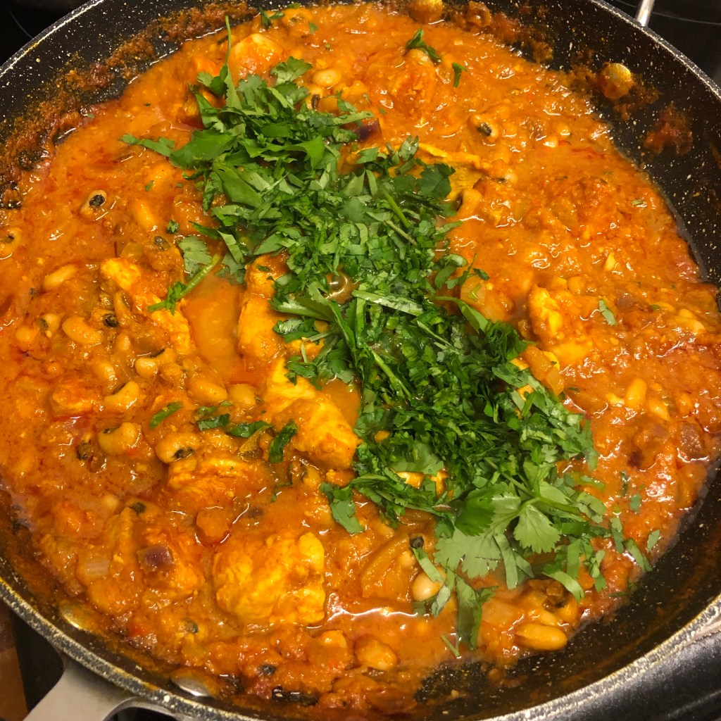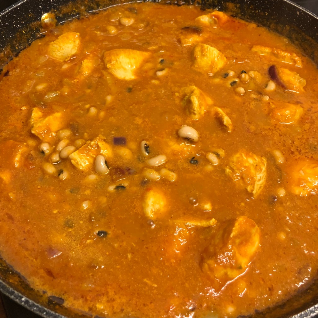 Ingredients- 1 tbsp of rapeseed oil, 1/2 onion ( I had left overs of a white and red onion so I used those) 1 1/2 tsp of garlic and ginger paste, 1/2 tsp of ground cumin, 1/2 tsp of Kashmiri chilli powder, 2 tsp of mixed curry powder, 3 tbsp of tomato purée mixed with water to make a paste, 1 cup of pre-made base sauce, chicken fillets cut into bite size pieces, 1 tin of black beans which have been drained, salt and coriander to serve.