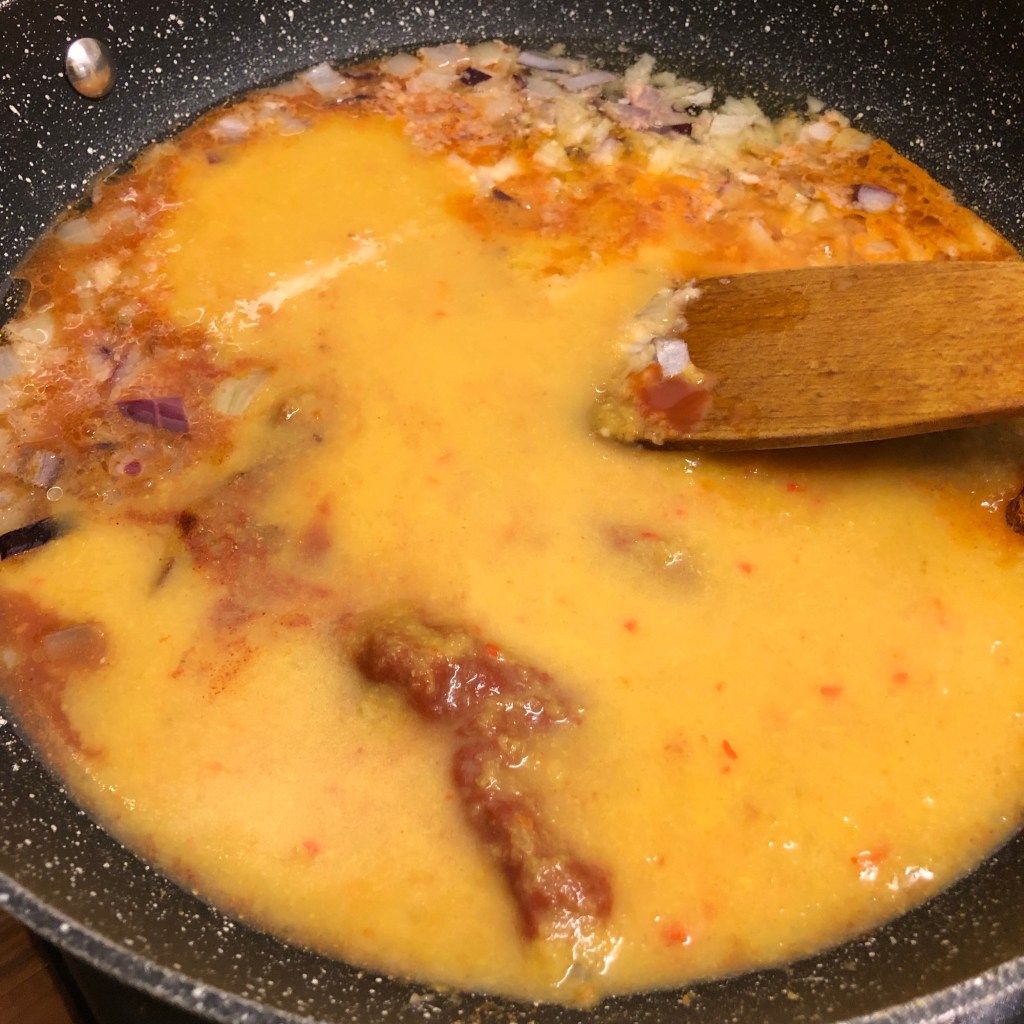Give it a good stir to break down the tomato purée. Bring to a simmer and allow it to bubble away for a few minutes. Remember to scrape in the caramelised edges.