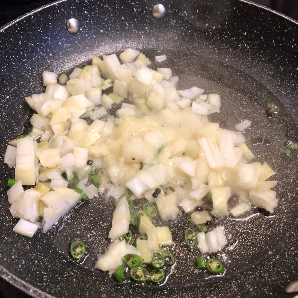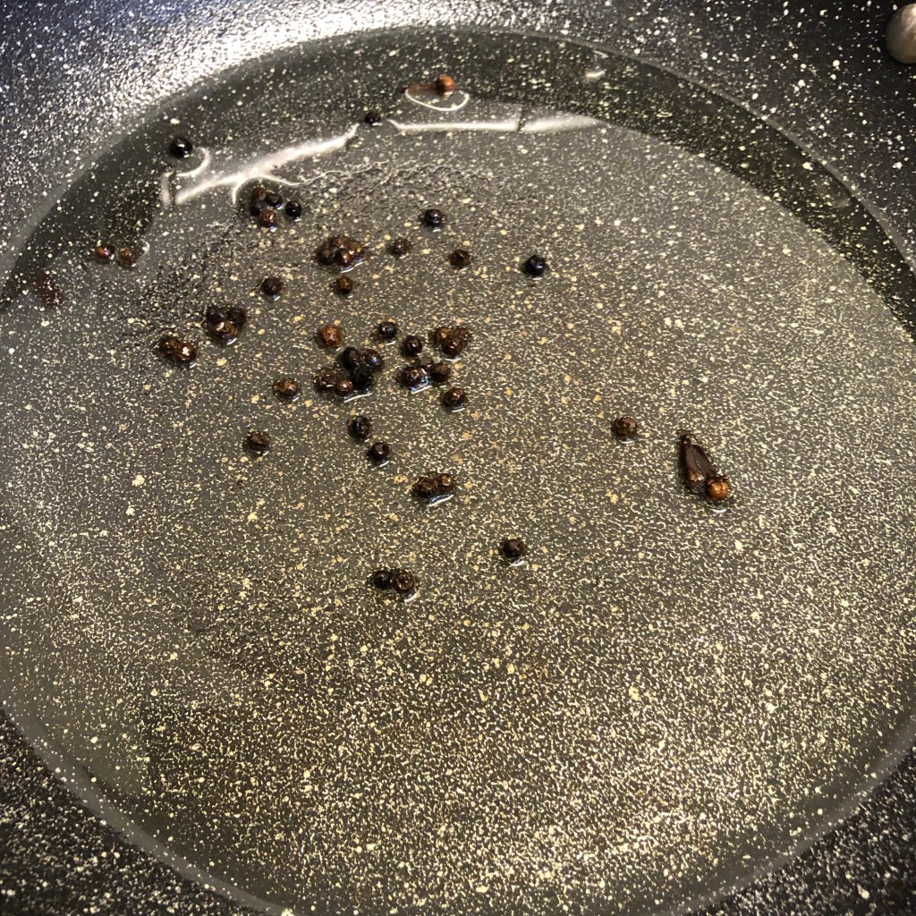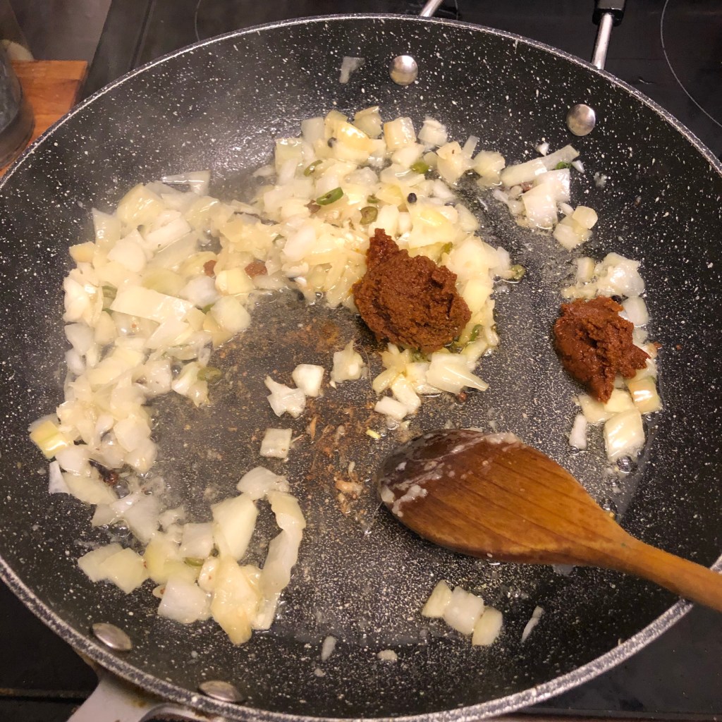 Heat the oil in a heavy based pan. Fry the cloves & peppercorns for 2 minutes. Then add the onions, chillies, garlic & ginger paste and cook / fry for another 5/6 minutes.