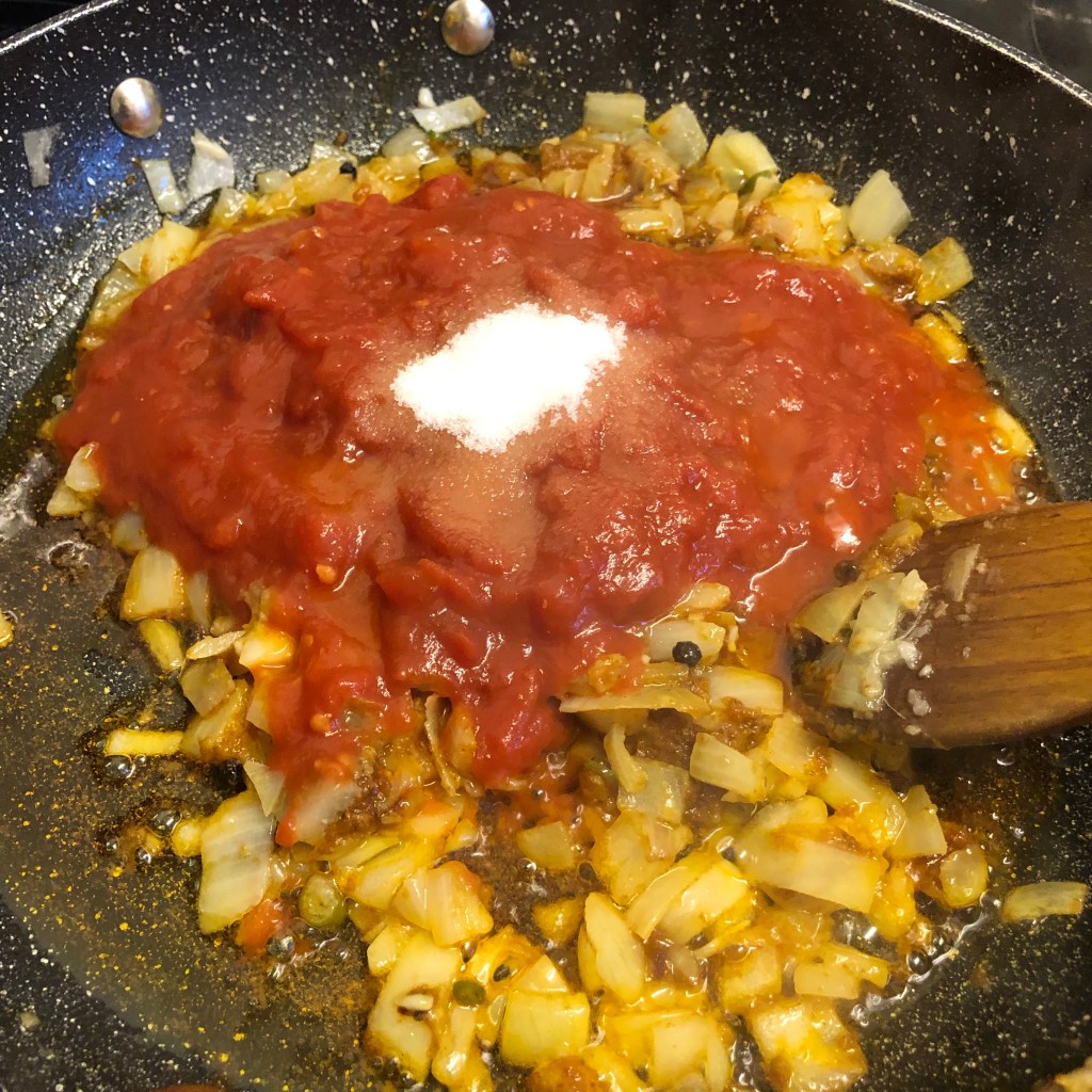 Add the chopped tomatoes along with the sugar plus 175ml of water. Simmer for another 5 minutes until the sauce thickens.