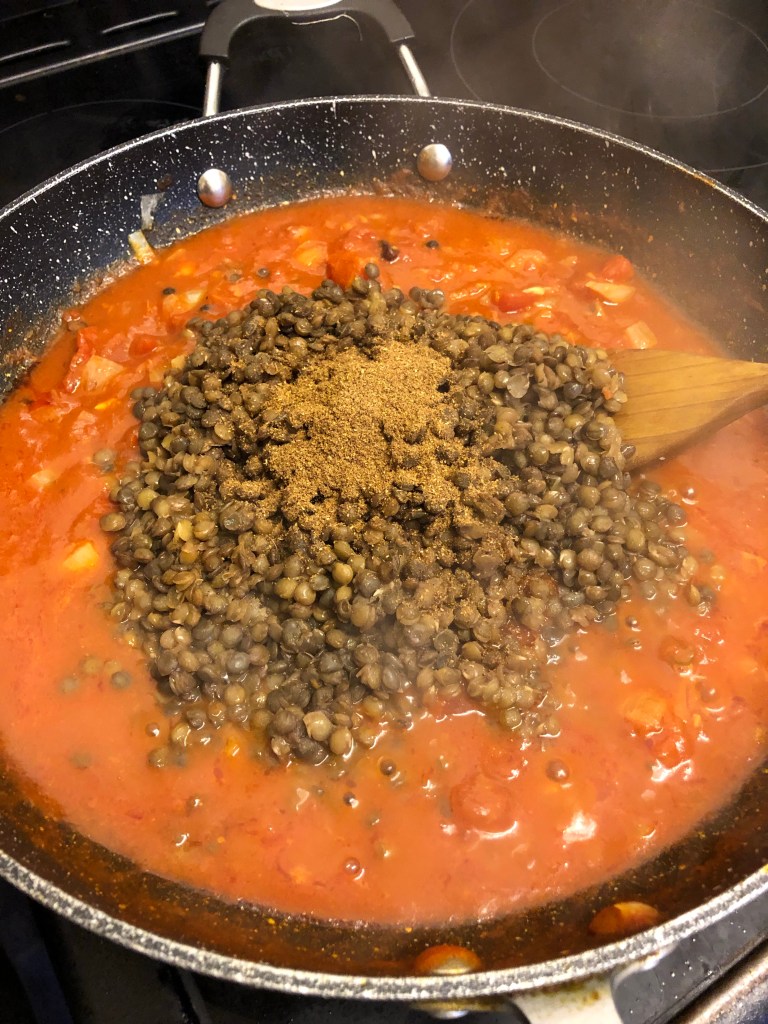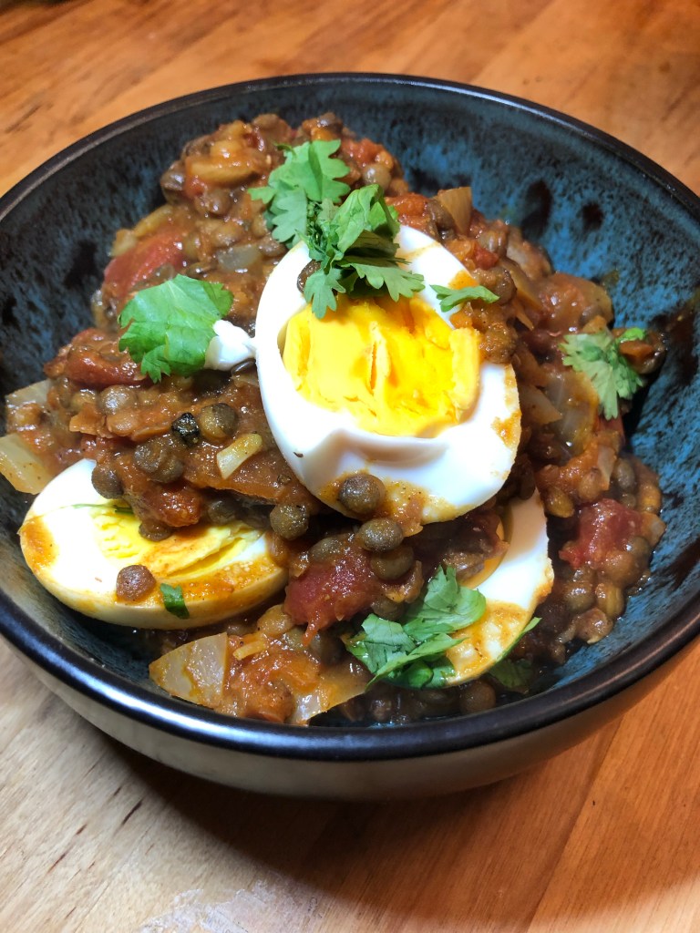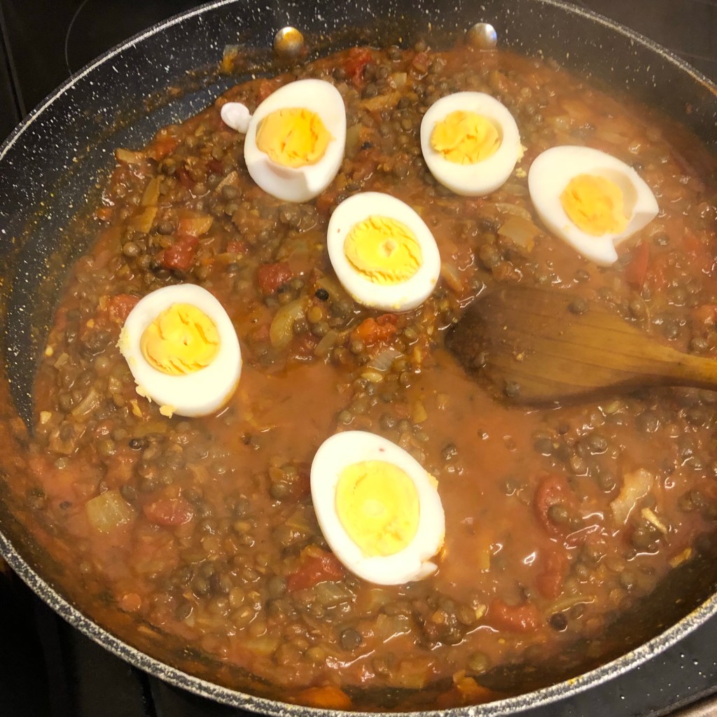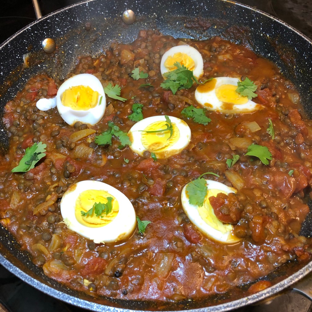 Ingredients- 1 1/2 cups of green lentils, 3 cups of water, 6 eggs, 2 tbsp of vegetable oil, 3 cloves, 1/4 tsp of black peppercorns, 1 onion finely diced, 2 green chillies finely diced, 1 heaped tbsp of garlic & ginger paste, 2 tbsp of any shop bought curry paste ( always carry one in the fridge for emergencies), 1 tin of chopped tomatoes, 1/2 tsp of sugar & 1/2 tsp of garam masala plus to finish a handful of chopped coriander.