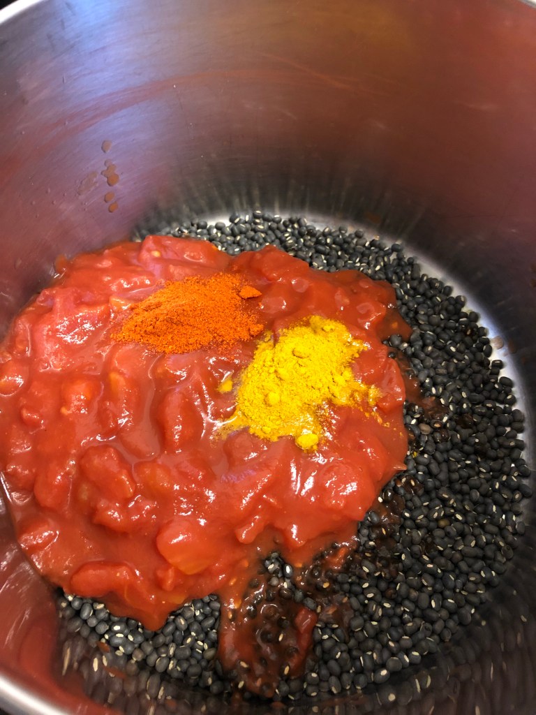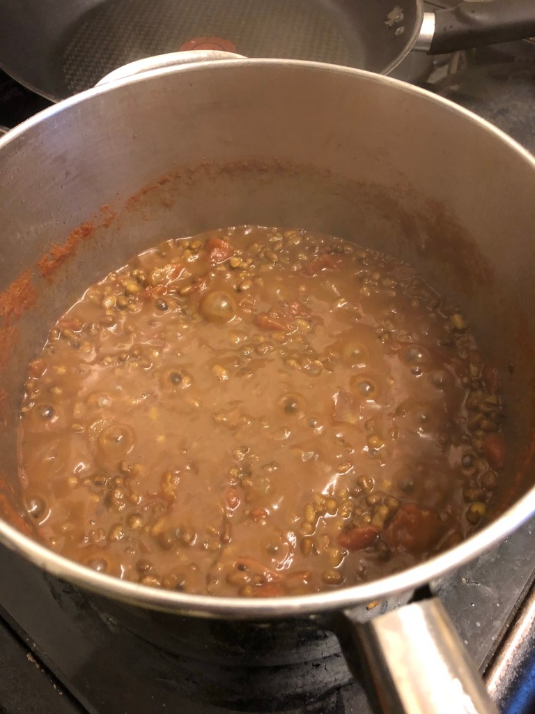 Method – In a large saucepan add the mung beans, 1 litre of water, chopped tomatoes, turmeric & chilli powder bringing it to the boil then lower the heat so it can simmer for 50/60 minutes having a flavour party !!