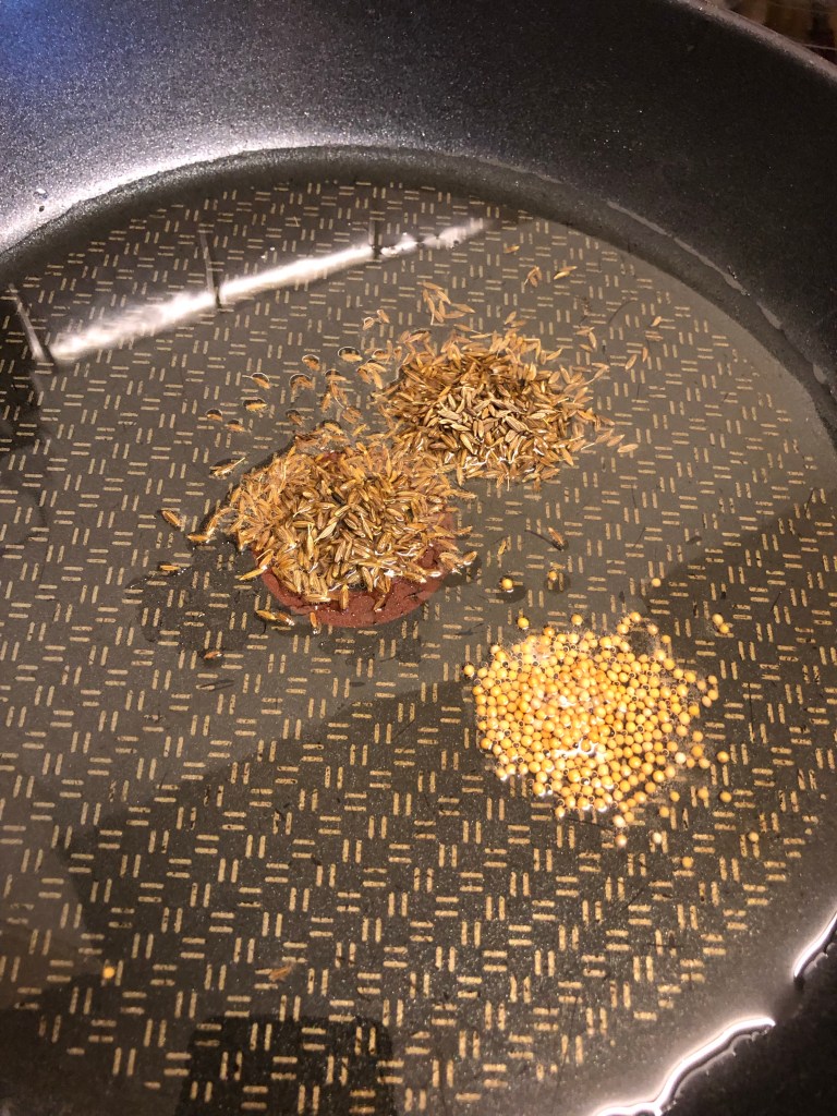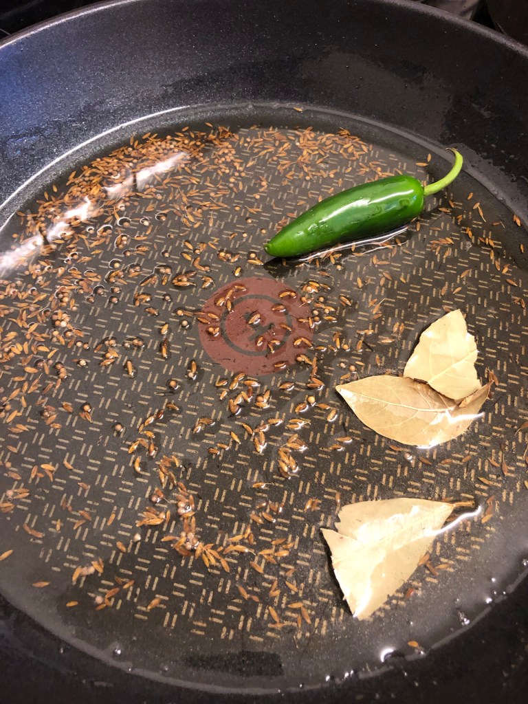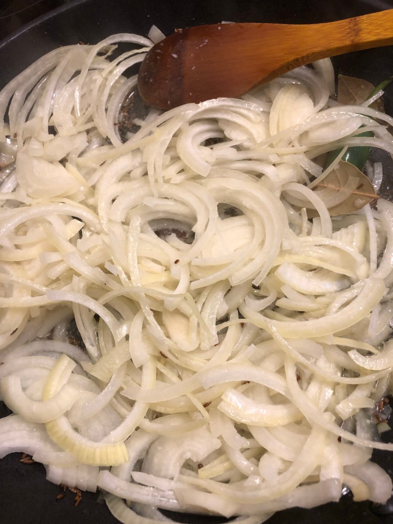 Add the vegetable oil to another large pan bringing the oil to a medium heat. When hot add cumin & mustard seeds frying until they have gone dark brown. Then add the green chilli, bay leaves, onions, ginger & garlic paste frying for 8 minutes or so until the onions have started to brown.