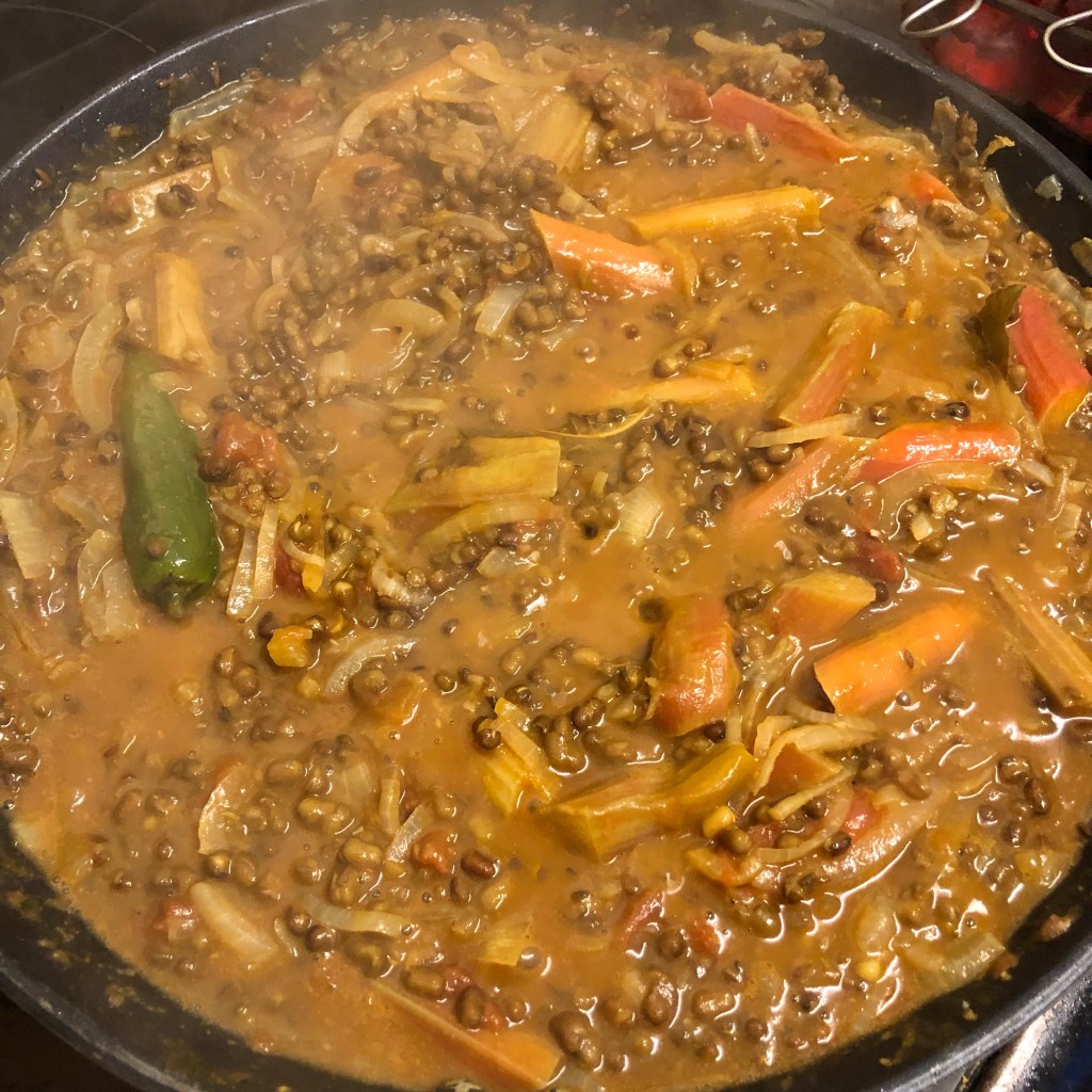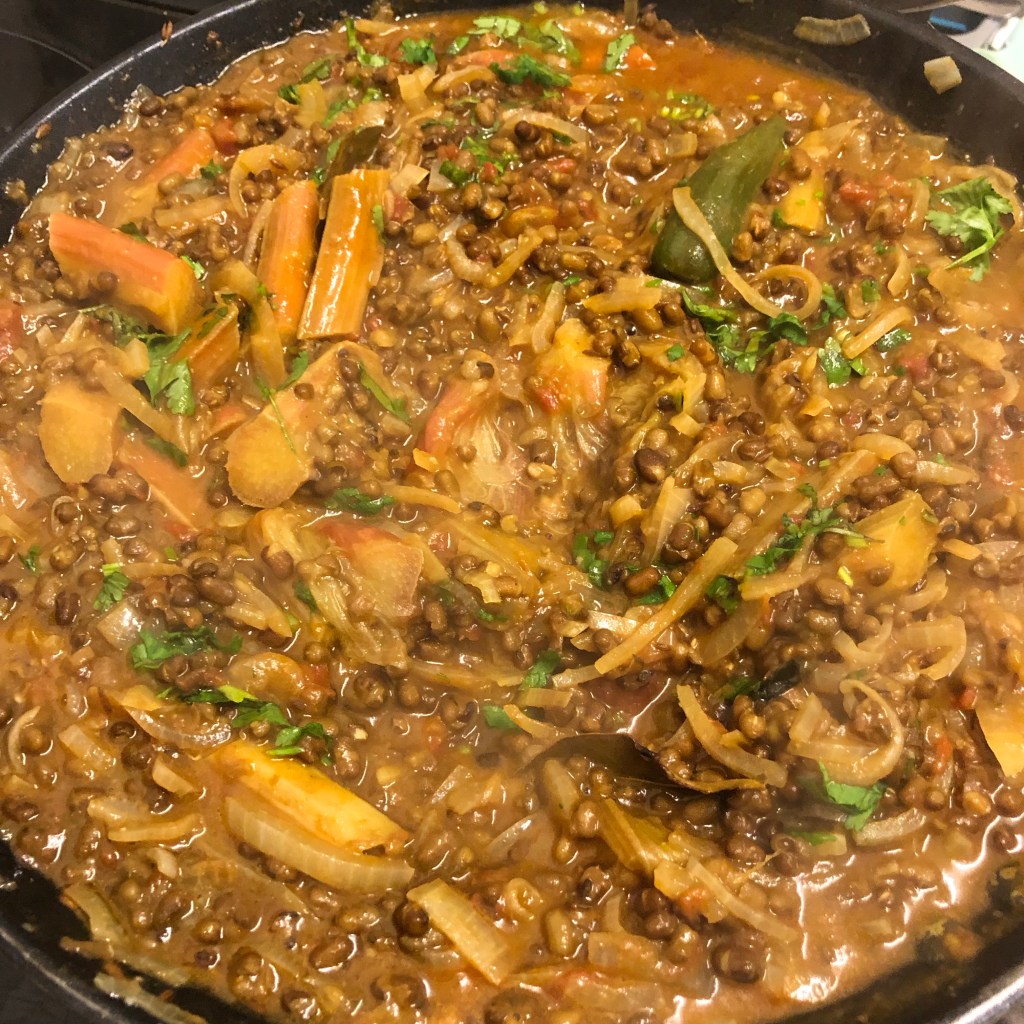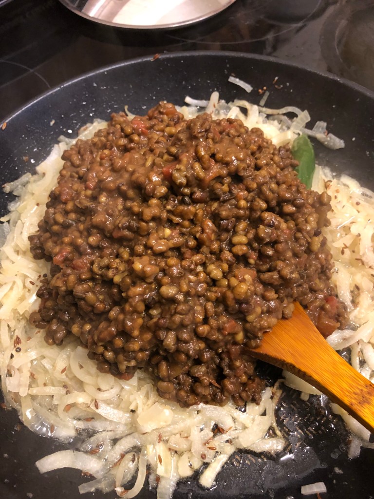Ingredients- 9oz green mung beans, 1/2 tin of chopped tomatoes, 1/4 tsp of turmeric, 1/4 tsp of chilli powder, 5 tbsp of vegetable oil, 1 1/2 tsp of cumin seeds, 1/2 tsp of mustard seeds, 1 large green chilli pierced, 2 bay leaves, 2 large onions finely diced, 2 tbsp of heaped garlic and ginger, 9oz of fresh rhubarb, juice of half a lemon, 1 tsp of salt, 1 tsp of sugar a large handful of coriander roughly chopped.