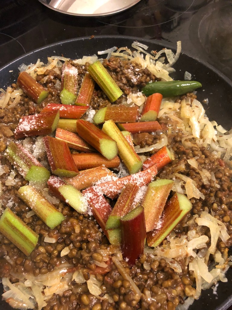 Turn down the heat then carefully add the cooked mung beans to the onion mix. Add the chopped rhubarb, lemon juice, salt & sugar bringing them to a simmer for 5/10 minutes.